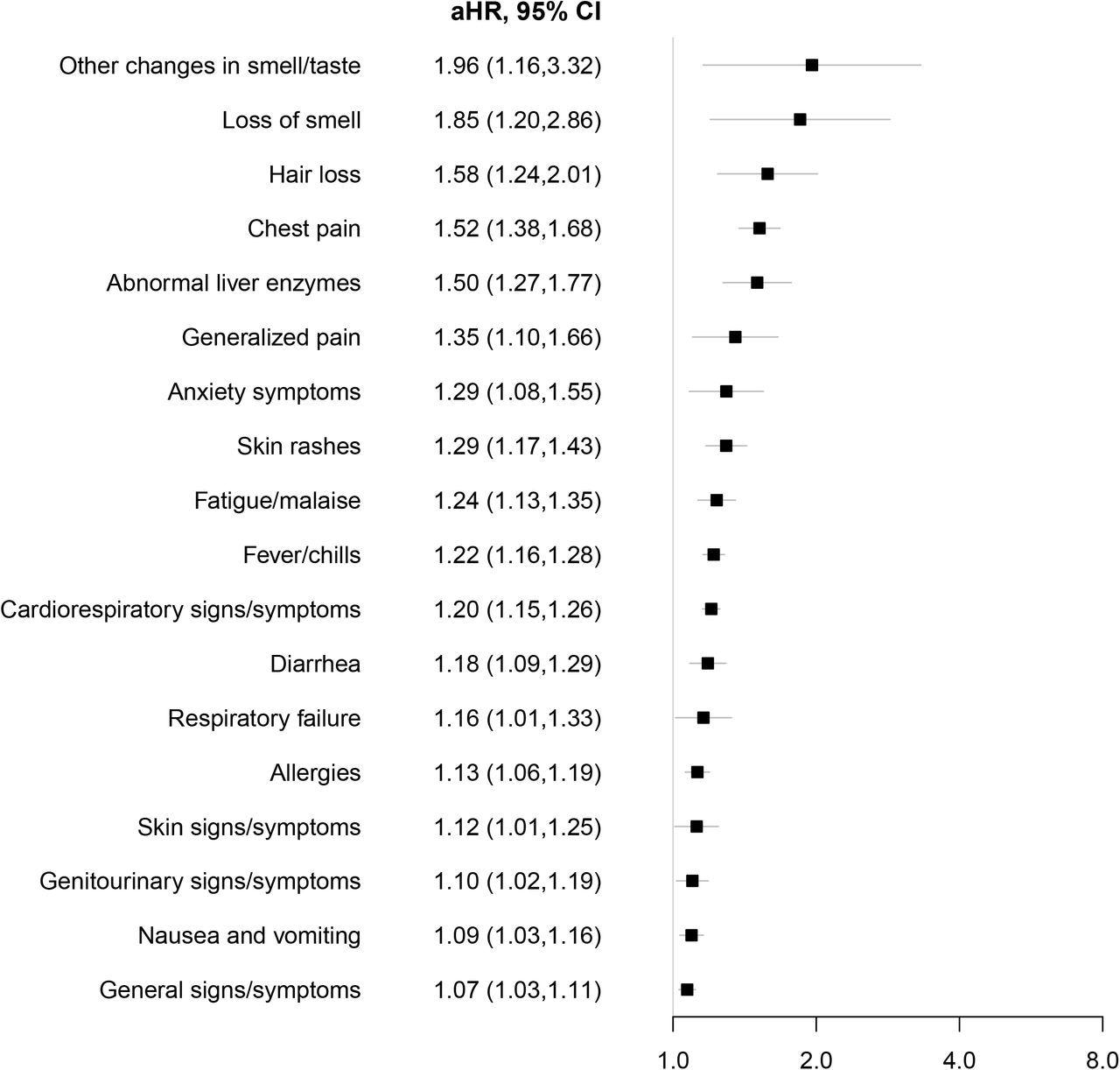 Syndromic PASC features associated with SARS-CoV-2 infection. Adjusted hazard ratios (aHR) with associated 95% CI among patients who tested positive for SARS-CoV-2 infection versus those who tested negative for the risk of each syndromic feature using Cox proportional hazards models. Models were adjusted for age at cohort entrance, sex, race/ethnicity, institution, testing place location, presence of a complex medical condition and date of cohort entrance.