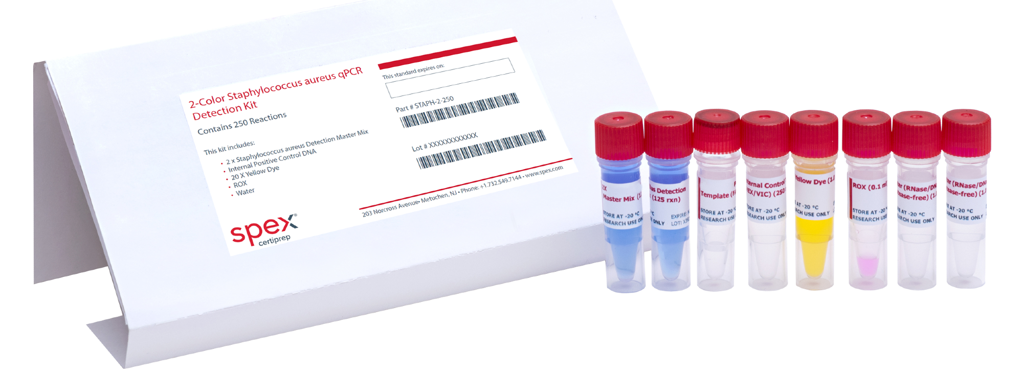 Quickly determine the presence of S. aureus bacteria and Salmonella in agricultural samples including cannabis products with Spex CertiPrep new quantitative PCR (qPCR) detection kits. The 2-Color Staphylococcus aureas Detection Kit is designed to determine the presence of S. aureus bacteria in a sample. The 2-Color Salmonella quantitative PCR (qPCR) Kit detects the presence of Salmonella species DNA. Both kits provide rapid and accurate test results with high specificity and work with any qPCR system that supports the two-color channel.