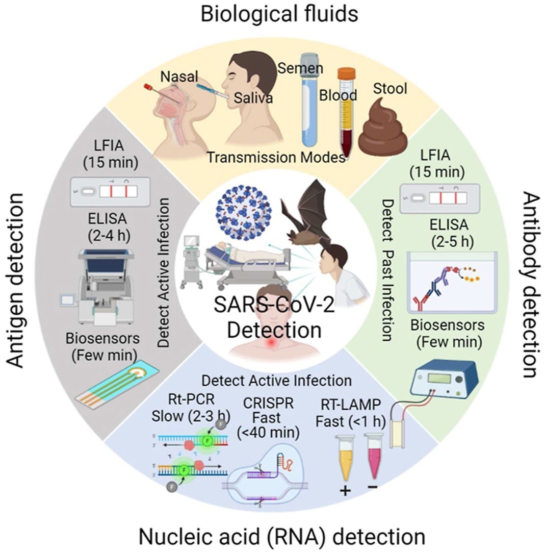 Molecular techniques for SARS-CoV-2 detection include reverse transcription-polymerase chain reaction (RT-PCR), RT loop-mediated isothermal amplification (RT-LAMP) and clustered regularly interspaced short palindromic repeats (CRISPR). While ELISA and RT-PCR require two to five ≥2 hours for SARS-CoV-2 detection, biosensors and LFIA can detect SARS-CoV-2 within a few minutes.