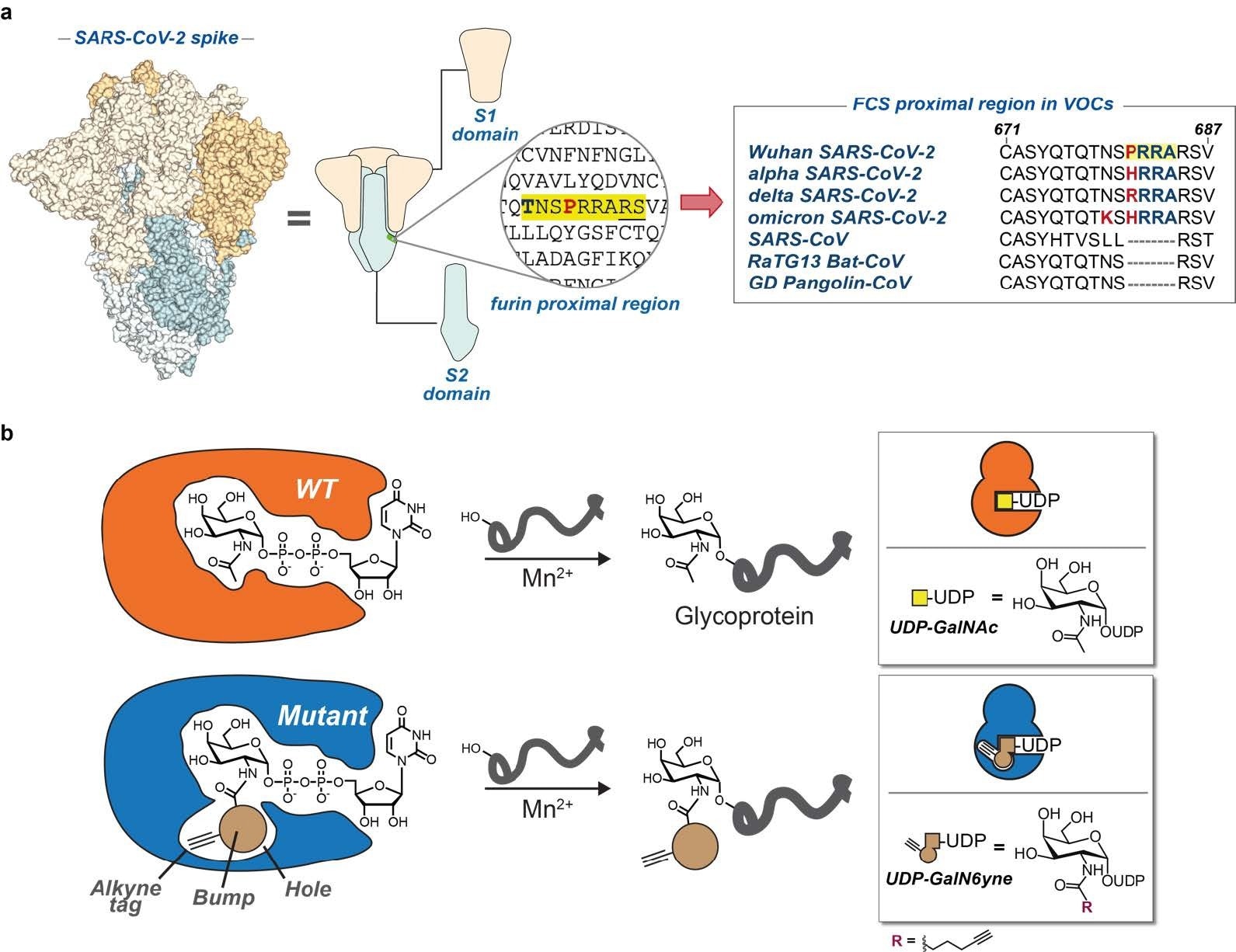 a) SARS-CoV-2 spike model and cartoon. Furin cleavage site and a peptide alignment for COVID- 19 variants of concern and related coronaviruses. Highlighted in yellow is the polybasic motif of SARS-CoV- 2. Bold and red are amino acid changes in positions 679 and 681. b) Bump-and-hole engineering allows for GalNAc-T isoenzyme-specific tagging of glycosylation substrates using the clickable substrate UDPGalN6yne. FCS = furin cleavage site; VOCs = variants of concern.