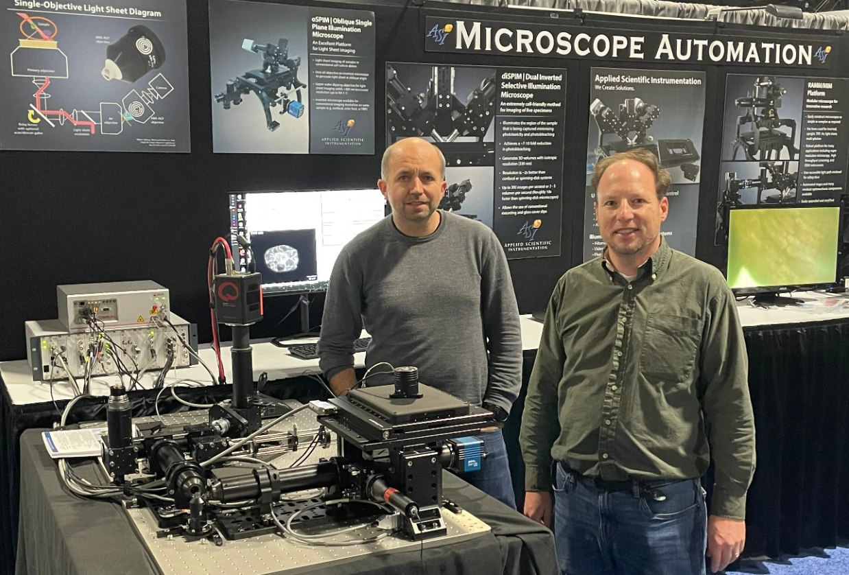 Jon Daniels, Senior Engineer at Applied Scientific Instrumentation and Florian Fahrbach, Open Innovation Specialist at Leica Microsystems pictured at the Cell Bio 2022 launch of the open, customizable platform for single-objective light-sheet microscopy co-developed by ASI and Leica Microsystems. Image credit: Leica Microsystems GmbH