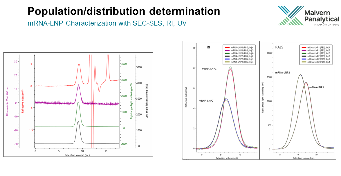 The OMNISEC can measure the absolute molecular weight and the concentration of multiple populations (if our sample has been separated into multiple populations). This will give us information about aggregation, oligomeric states, and fragments. Additionly, when you have LNPs you also have a distribution of sizes. The absolute molecular weight is measured at each time point and thus gives us an idea about the distribution of molecular weights present in the sample. That information can tell us about sample stability, the complex molecular weight, and the particle formation quality.