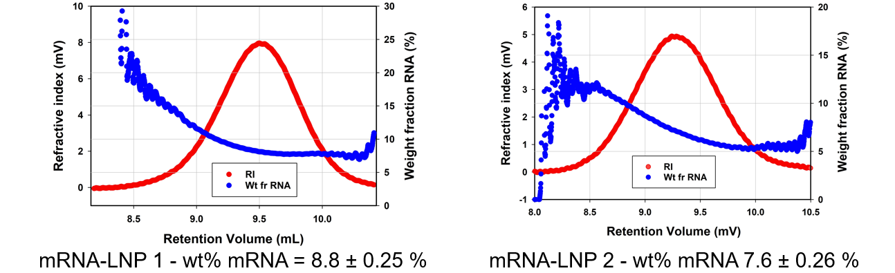 Let's compare our two samples. The mRNA-LNP 1 has a weight percentage of mRNA of 8.8 % and mRNA-LNP 2 was found to be lower at 7.6 %. This result can also be graphed, you can we have put the weight fraction mRNA on the Y axis below. It is interesting to observe that the larger, earlier eluting portions of the sample contain a higher weight fraction of mRNA. This poses the question; are the bigger LNPs within this range more efficient for encapsulating and delivering the payload?