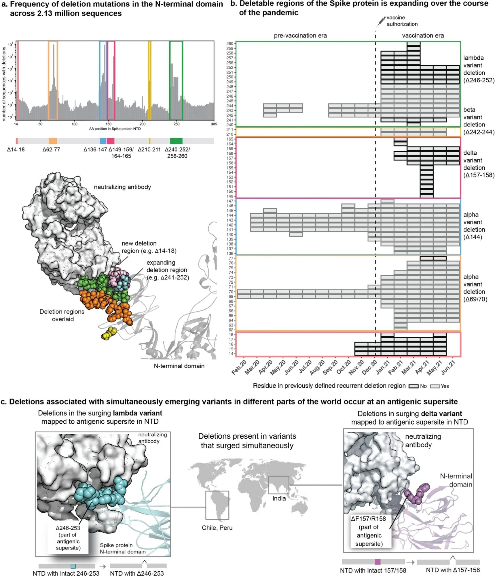 Overall, the results suggested that expanding regions and increasing frequencies of deletions, particularly in the antigenic regions surrounding the spike protein NTD, could be driving the evolution of SARS-CoV-2 variants with increased transmission and immune evasive abilities.