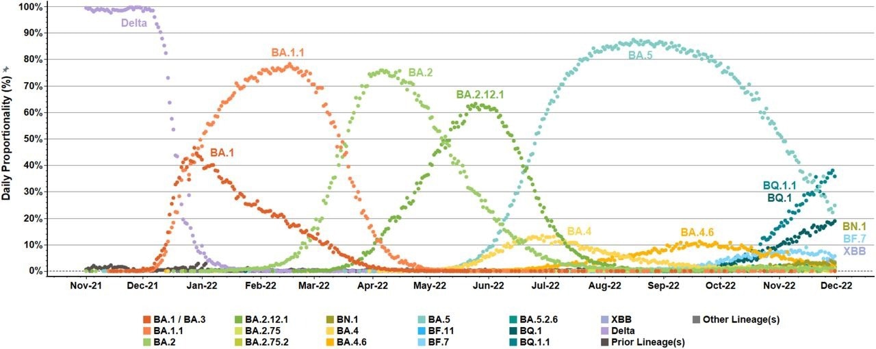 Emergence and diversification of SARS-CoV-2 Omicron variants and lineages in US surveillance networks. Daily, percent proportionalities (dot icons, 0% to 100%) were summarized for detected variant/lineage populations within US National SARS-CoV-2 Strain Surveillance (NS3) and baseline surveillance initiatives from November 1, 2021, to November 30, 2022. Reported sequences were aggregated and color-coded based on attributed Pango lineages. Delta (B.1.617.2) variant preceded the emergence and expansion of Omicron (B.1.1.529, BA) variant within US surveillance networks. Several tracked Omicron (BA) lineages (e.g., BA.2.75, BA.2.75.2, BF.11, and BA.5.2.6) were detected at low levels (≤10%, labels not shown). “Prior lineages” included additional A and B lineages with limited detection. “Other lineages” consolidated the few specimens with no assigned Pango nomenclature or non-XBB X lineage.