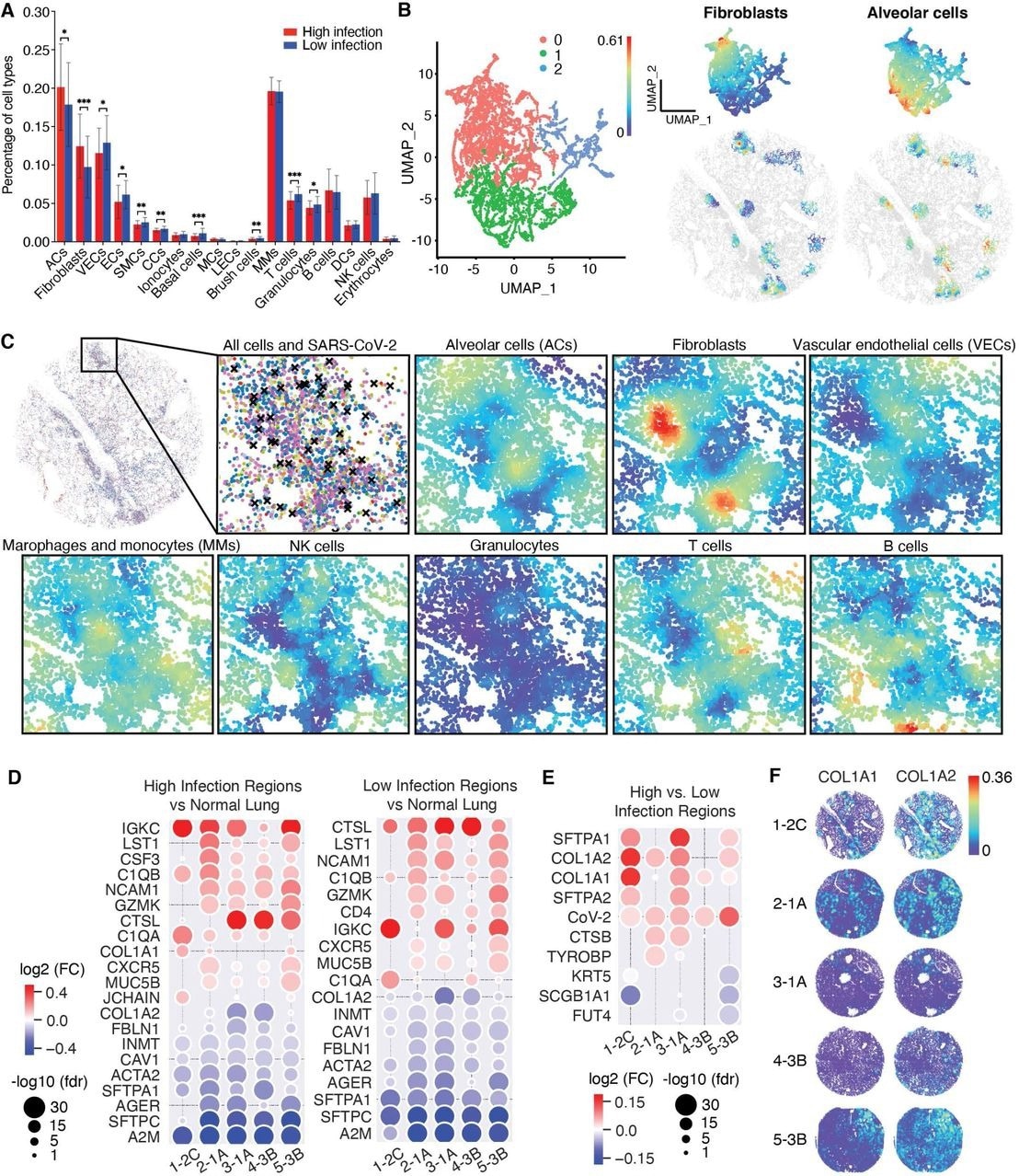 NCTC analysis showed three clusters in high-infection regions, two of which were distinctly enriched with prominent local compositions of fibroblasts and ACs, respectively. The high and low infection regions sharing 18 of 20 DEGs presented highly consistent differential expression patterns, thus indicating the pronounced indirect effects of SARS-CoV-2 infection.