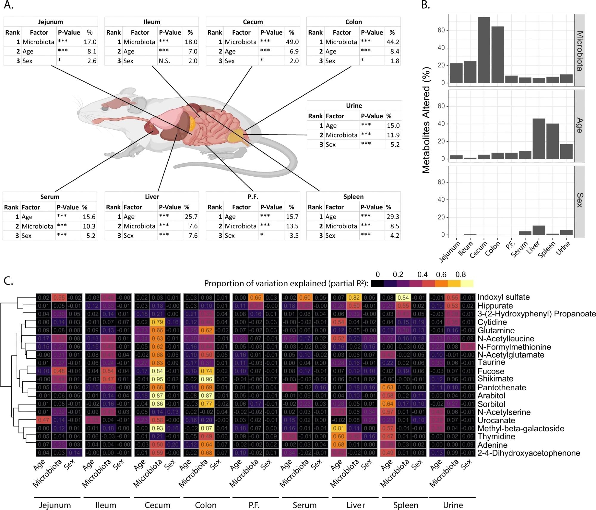 A Estimated proportion of variation explained by microbiota, age and sex in each site sampled based on PERMANOVA statistics. B Proportion of metabolites altered (PAdj <0.05) by microbiome, age, and sex at each site. C Partial R2 showing the relative contribution of age, microbiota, and sex in explaining the variation in metabolite abundance at each site. Metabolites shown are the 20 metabolites where the most variation was explained by the three factors, full heatmap for all metabolites is shown in Supplementary Figure 1. Data is representative of n = 72 samples / site (equal representation from male and female mice, GF, OMM12 and SPF colonized mice and 3-, 8- and 12-week-old mice). P.F. = peritoneal fluid. Parts of Fig. 2A were generated using Biorender.org under license. Source data are provided as a Source Data file.