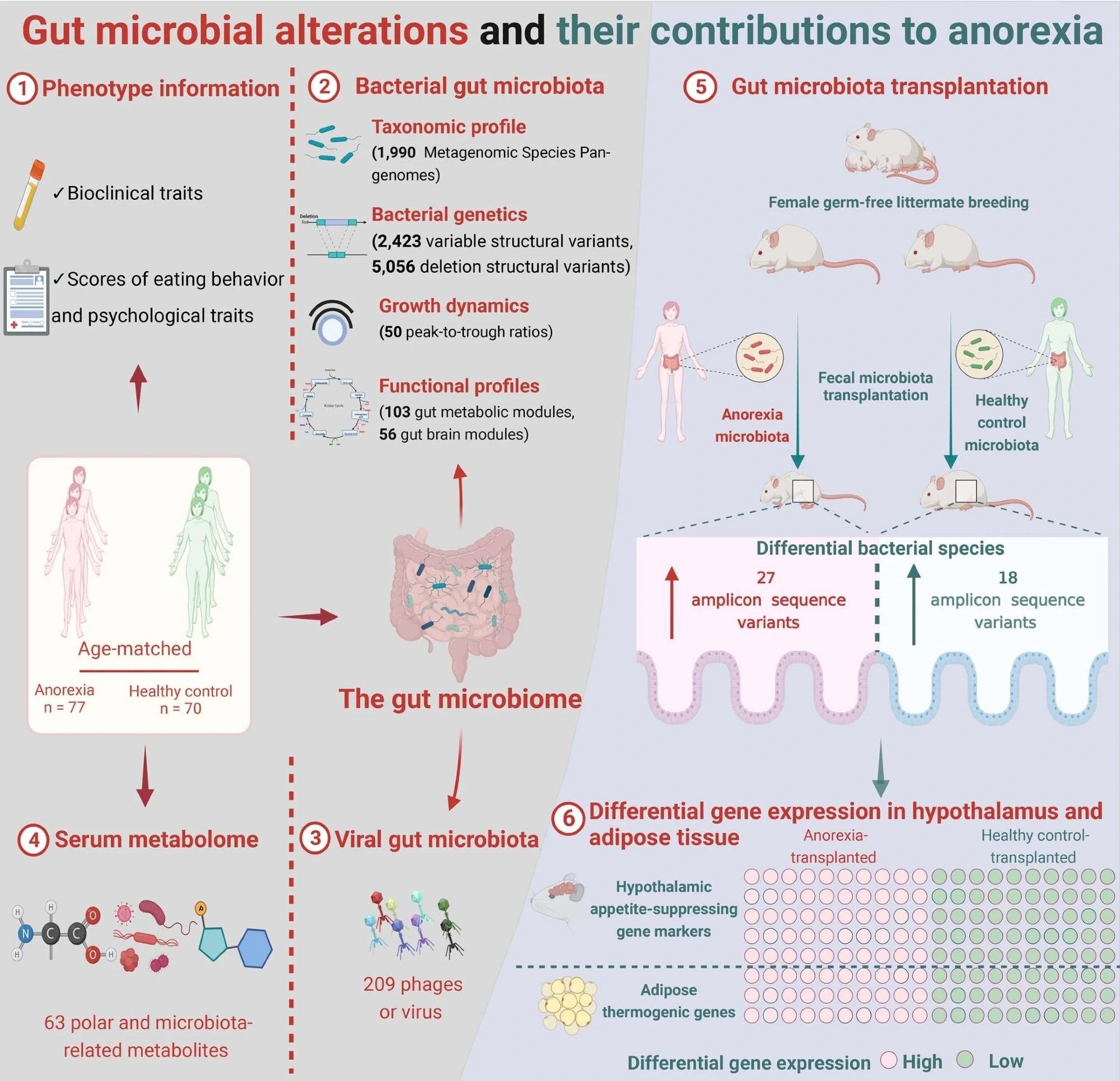 The team detected 2,423 and 5,056 variable SVs and deletion SVs, respectively, across 56 species of bacteria, including Bacteroides uniformis, Faecalibacterium prausnitzii, Parabacteroides distasonis, Methanobrevibacter smithii. Individuals with AN lacking the genomic region of B. uniformis had greater scores for self-denial and bulimia. The genetic deletion in B. uniformis could result in the deficiency of thiamine, a vitamin associated with intestinal and mental health. The serotonin synthesis module causally affected BMI through glycoursodeoxycholic acid, which is upregulated by serotonin.