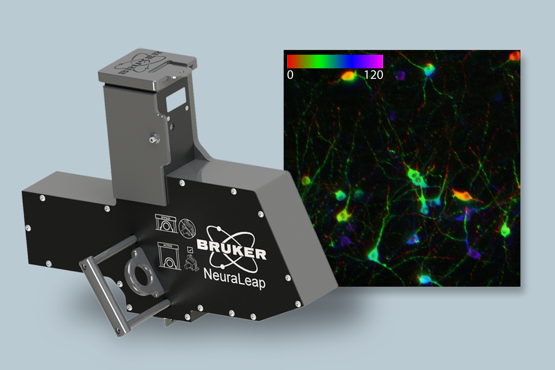 The NeuraLeap module (left) was used to scan (120 µm section) and color-code by depth the dopaminergic neurons of a mouse ventral tegmental area (right). Image credit: Bruker