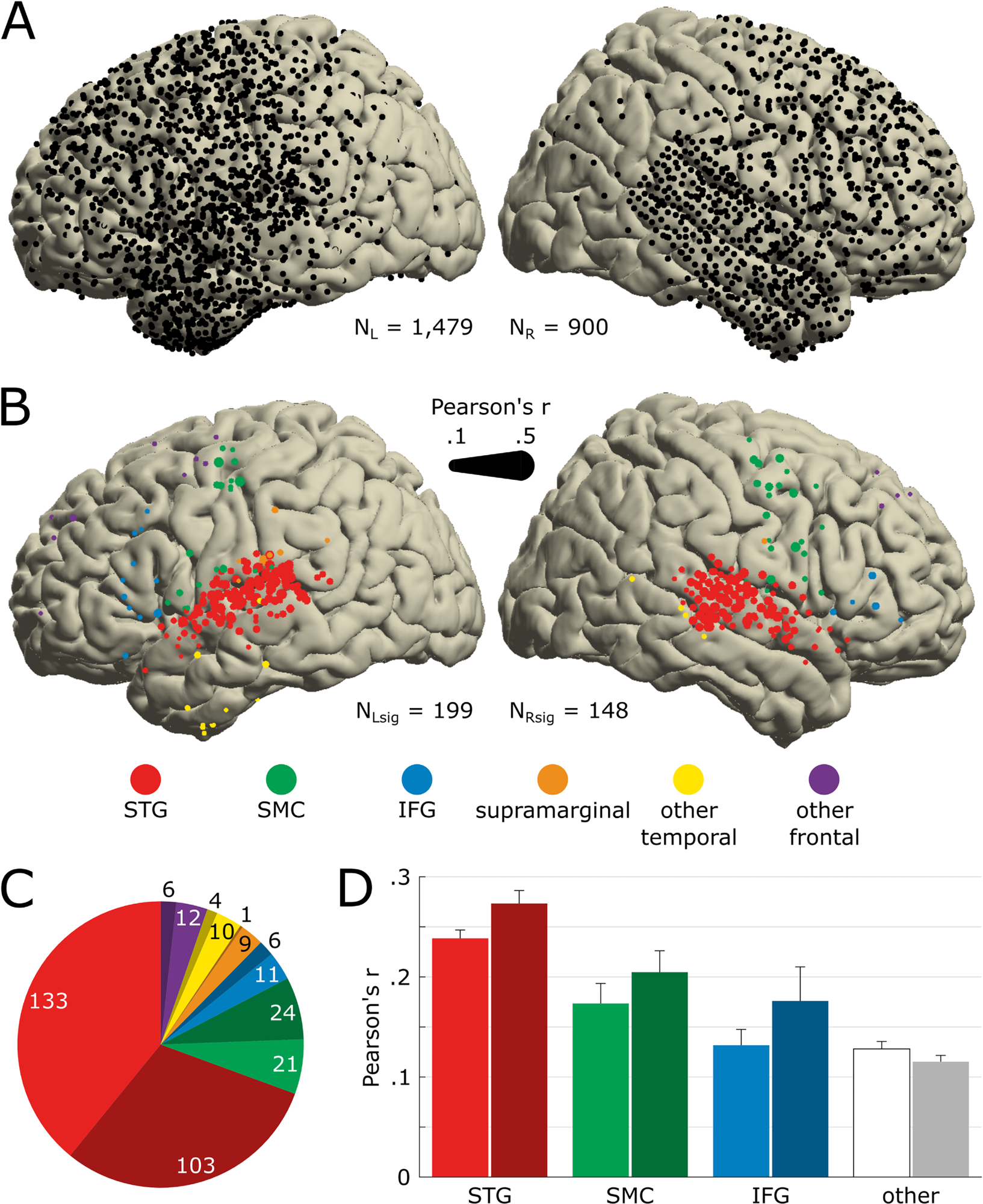 Anatomical location of song-responsive electrodes.(A) Electrode coverage across all 29 patients shown on the MNI template (N = 2,379). All presented electrodes are free of any artifactual or epileptic activity. The left hemisphere is plotted on the left. (B) Location of electrodes significantly encoding the song’s acoustics (Nsig = 347). Significance was determined by the STRF prediction accuracy bootstrapped over 250 resamples of the training, validation, and test sets. Marker color indicates the anatomical label as determined using the FreeSurfer atlas, and marker size indicates the STRF’s prediction accuracy (Pearson’s r between actual and predicted HFA). We use the same color code in the following panels and figures. (C) Number of significant electrodes per anatomical region. Darker hue indicates a right-hemisphere location. (D) Average STRF prediction accuracy per anatomical region. Electrodes previously labeled as supramarginal, other temporal (i.e., other than STG), and other frontal (i.e., other than SMC or IFG) are pooled together, labeled as other and represented in white/gray. Error bars indicate SEM. The data underlying this figure can be obtained at https://doi.org/10.5281/zenodo.7876019. HFA, high-frequency activity; IFG, inferior frontal gyrus; MNI, Montreal Neurological Institute; SEM, Standard Error of the Mean; SMC, sensorimotor cortex; STG, superior temporal gyrus; STRF, spectrotemporal receptive field. ​​​​​​​https://doi.org/10.1371/journal.pbio.3002176.g002