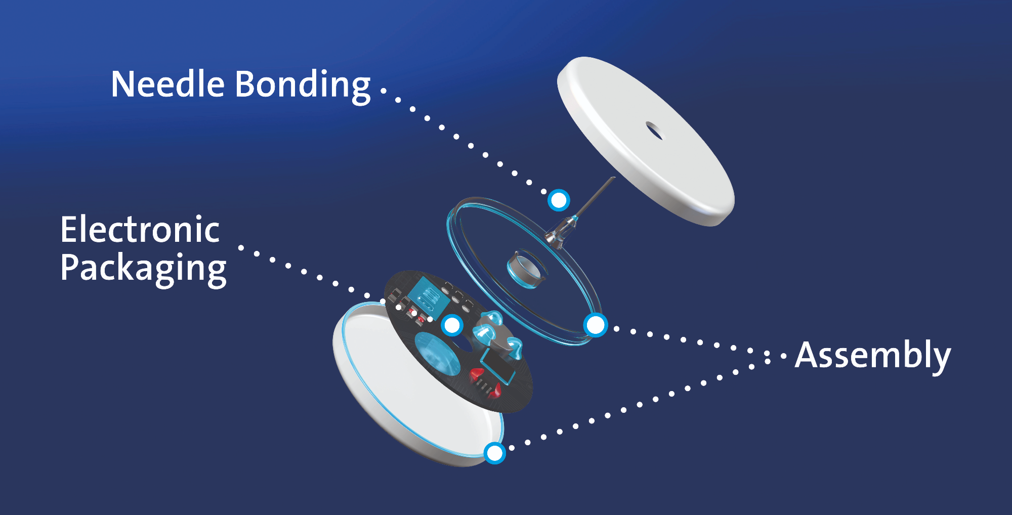 This work cell permits components to remain in one position for both dispensing and UV curing processes. Parts handling is minimized,  along with the risks of  component movement, contamination, and adhesive migration.  This integrated system concept ensures the adhesive bonding process is performed to the highest quality standards with the greatest efficiency.   Whether batch production or continuous flow, integrated adhesive bonding systems from Panacol, Scheugenpflug, and Hönle meet the demanding production requirements for medical wearables.
