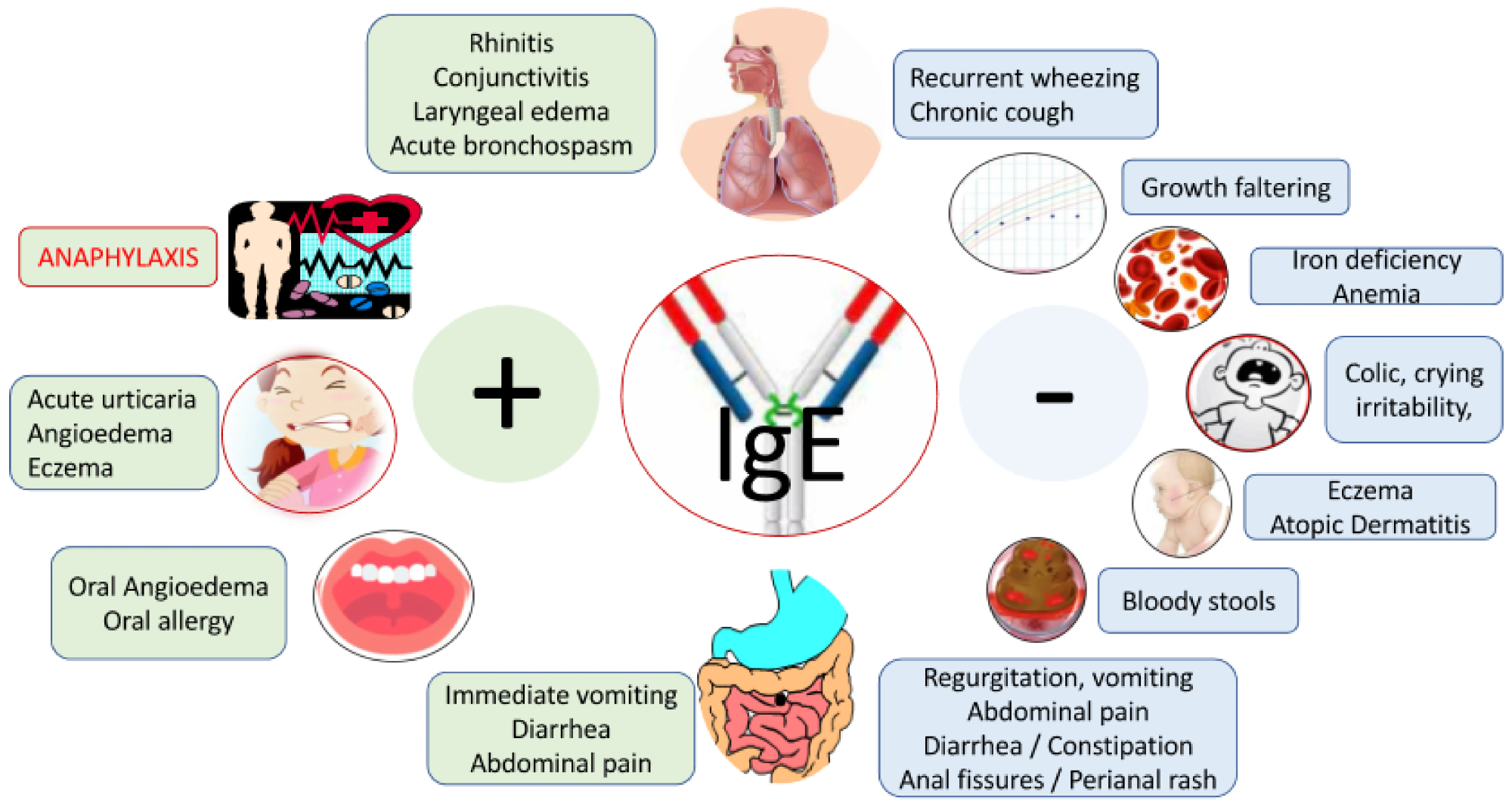 S​​​​​​​igns and symptoms associated with cow’s milk allergy. Legend: patients may also present with mixed IgE and non-IgE CMA symptoms; none of the symptoms are specific; symptoms are unrelated to infection.