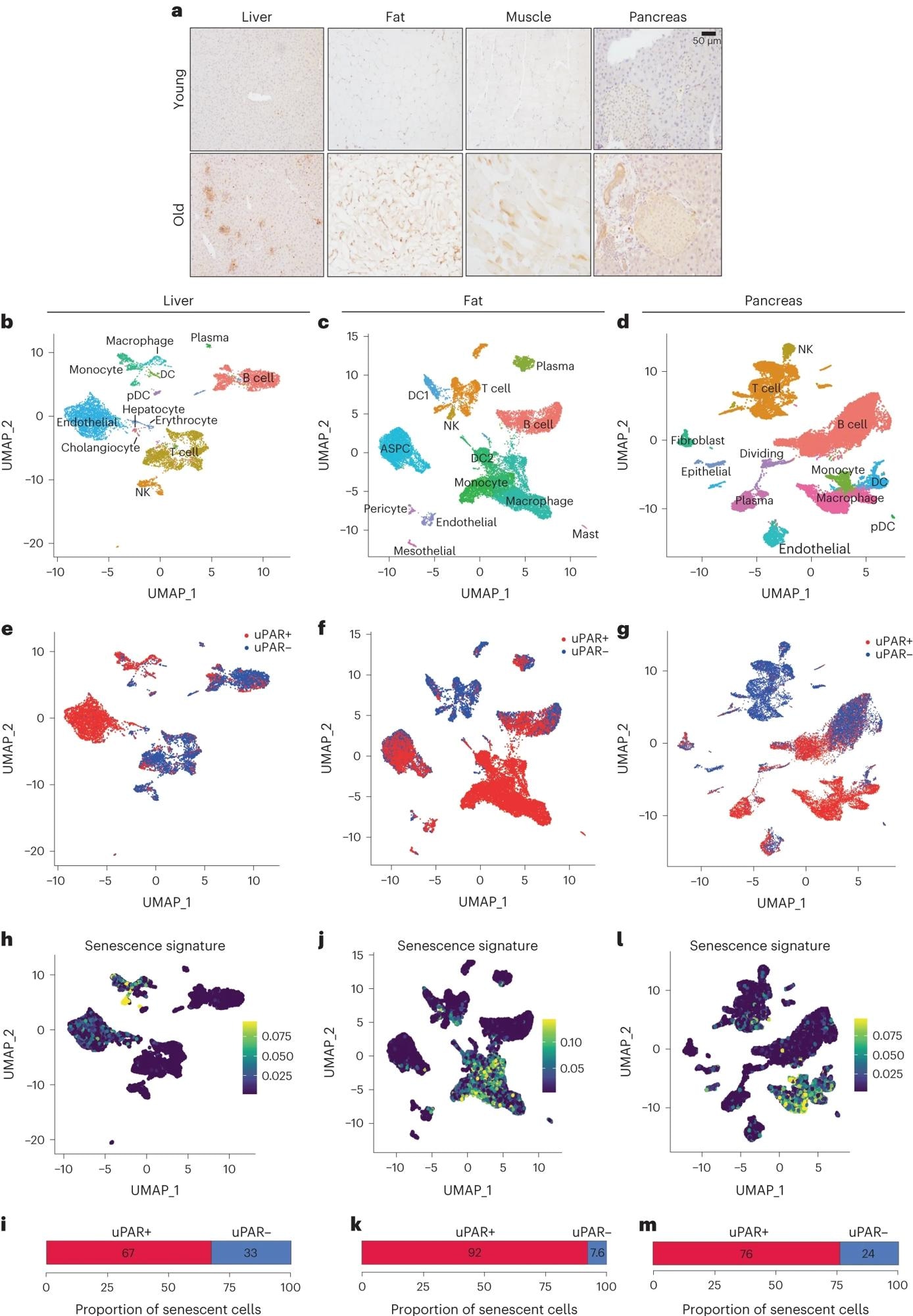 a, Immunohistochemical staining of mouse uPAR in liver, adipose tissue, muscle and pancreas from young (age 3 months) or old (age 20 months) mice (n = 3 per age). bm, Single-cell analysis of uPAR expression and senescence. uPAR-positive and uPAR-negative cells were sorted from the liver, adipose tissue and pancreas of 20-month-old mice and subjected to single-cell RNA-seq by 10x chromium protocol (n = the sequencing of four mice where two females were combined into one replicate and two males were combined into another replicate). b, Uniform manifold approximation and projection (UMAP) visualization of liver cell types. c, UMAP visualization of adipose tissue cell types. d, UMAP visualization of pancreas cell types. e, UMAP visualization of hepatic uPAR-negative and uPAR-positive cell types. f, UMAP visualization of adipose uPAR-negative and uPAR-positive cell types. g, UMAP visualization of pancreatic uPAR-negative and uPAR-positive cell types. h,j,l, UMAP visualizations with senescence signature scores24 in each cell indicated by the color scale. i,k,m, Quantification of the proportion of uPAR-positive and uPAR-negative cells contributing to the respective senescence signature. h,i, Liver; j,k, adipose tissue; l,m, pancreas. Results are from one independent experiment (am). DC, dendritic cell; NK, natural killer; pDC, plasmacytoid dendritic cell; ASPC, adipose progenitor and stem cells.