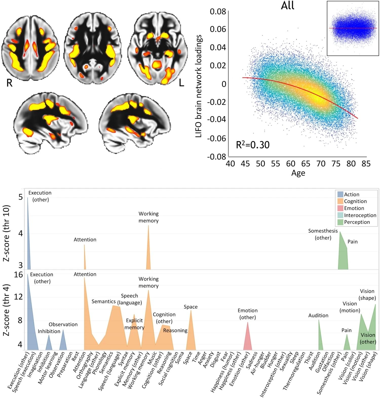 Top left, spatial map of the LIFO network (in red-yellow, thresholded at Z > 4 for visualization) used to extract the loadings from every scanned participant from UK Biobank (n = 39,676). Top right, these LIFO loadings (in arbitrary units) show a strong quadratic association with age in the UK Biobank cohort, i.e., grey matter volume decreases quadratically with older age in these specific regions (R2 = 0.30, P < 2.23 × 10−308; inset: residual scatterplot). Bottom, the vulnerable network appears to encompass areas mainly involved in execution, working memory, and attention (using the BrainMap taxonomy and with the LIFO brain network thresholded at both Z = 4 and Z = 10