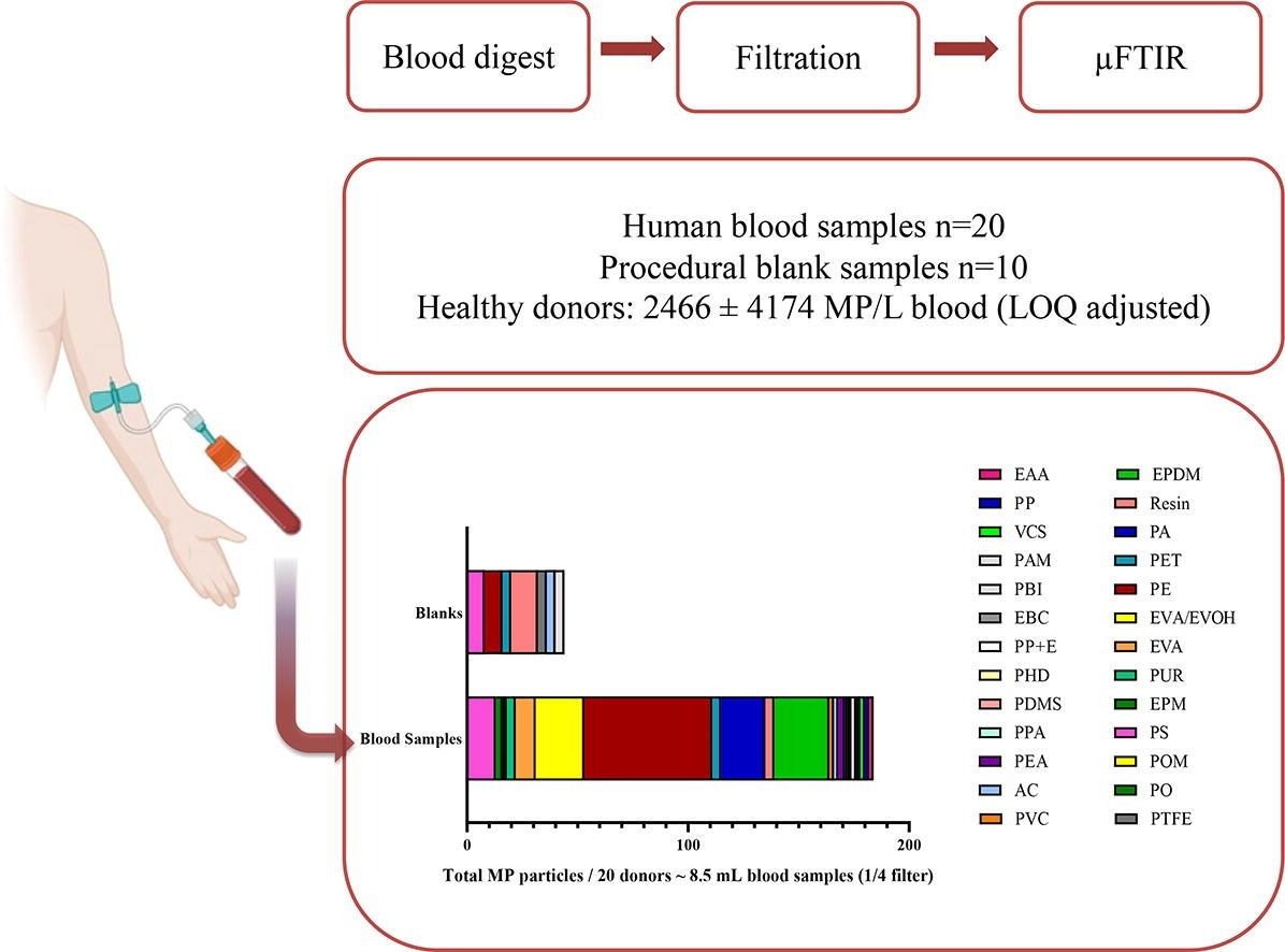 The study identifies 24 different polymer types of microplastics in human blood samples. Polyethylene, ethylene propylene diene, and ethylene–vinyl-acetate/alcohol are the most abundant polymer types in blood samples.