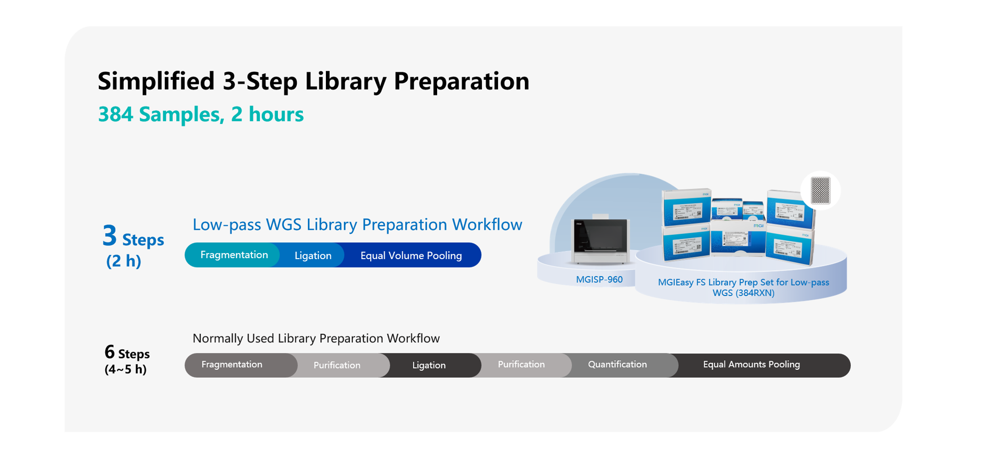 The new MGIEasy Large-scale PCR-Free FS Library Prep Set for Low-pass WGS, available in two specifications, 96RXN and 384RXN, is designed specifically for Low-pass WGS applications with a new plate-based library preparation reagent module. Compared with common PCR-free library preparation sets on the market, this kit cuts the purification step and completes library construction in three easy steps, reducing the time and consumables required.
