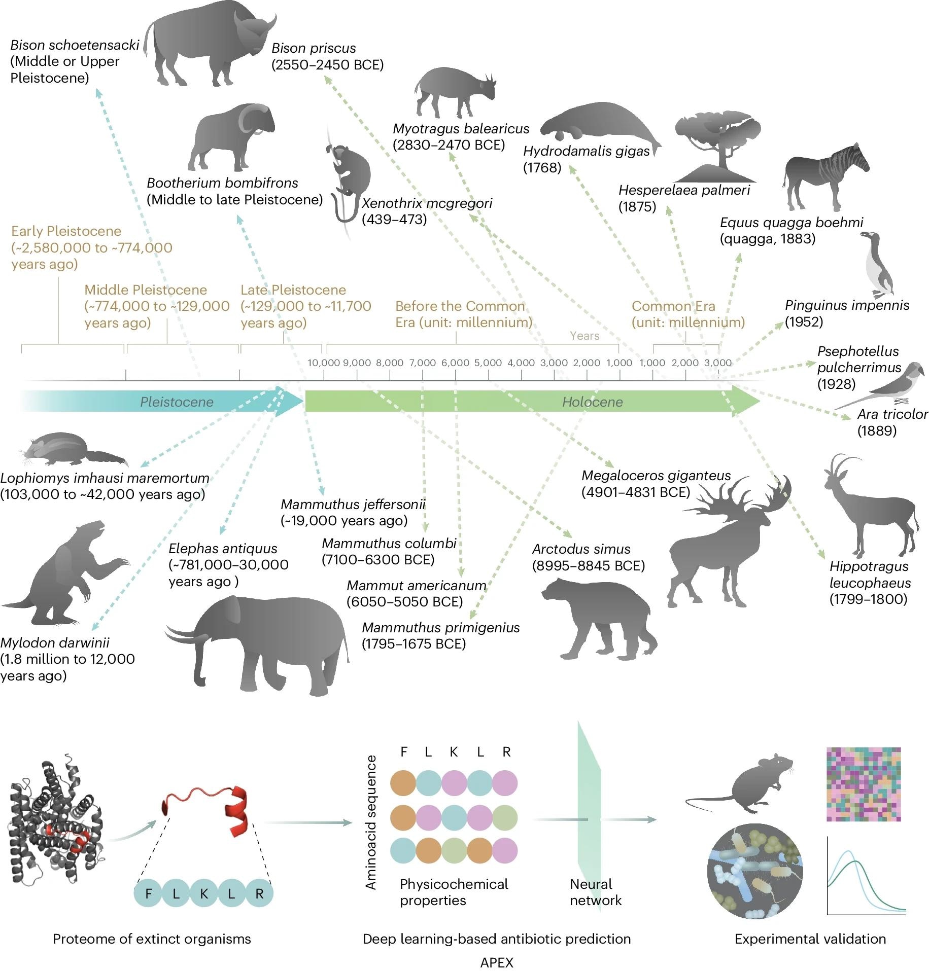 Molecular de-extinction of antibiotics from ancient proteomes using deep learning. All available proteomes of extinct organisms were mined by APEX, our deep learning algorithm. Amino acid sequences ranging from 8 to 50 amino acid residues within proteins from extinct organisms were inputted into multitask deep learning models that trained on both public and in-house peptide data to evaluate the potential antimicrobial activity. The highest ranked peptides based on predicted antimicrobial activities were then selected and thoroughly characterized against clinically relevant pathogens both in vitro and in animal models. The mechanism of action, physicochemical features and synergistic interactions of these peptides were also assayed. The dates report the approximate extinction date or period for the organisms studied. The protein and peptide structures shown in the figure were created with PyMOL Molecular Graphics System, version 2.1 Schrödinger, LLC.Molecular de-extinction of antibiotics from ancient proteomes using deep learning. All available proteomes of extinct organisms were mined by APEX, our deep learning algorithm. Amino acid sequences ranging from 8 to 50 amino acid residues within proteins from extinct organisms were inputted into multitask deep learning models that trained on both public and in-house peptide data to evaluate the potential antimicrobial activity. The highest-ranked peptides based on predicted antimicrobial activities were then selected and thoroughly characterized against clinically relevant pathogens both in vitro and in animal models. The mechanism of action, physicochemical features, and synergistic interactions of these peptides were also assayed. The dates report the approximate extinction date or period for the organisms studied. The protein and peptide structures shown in the figure were created with PyMOL Molecular Graphics System, version 2.1 Schrödinger, LLC. Study: Deep-learning-enabled antibiotic discovery through molecular de-extinction