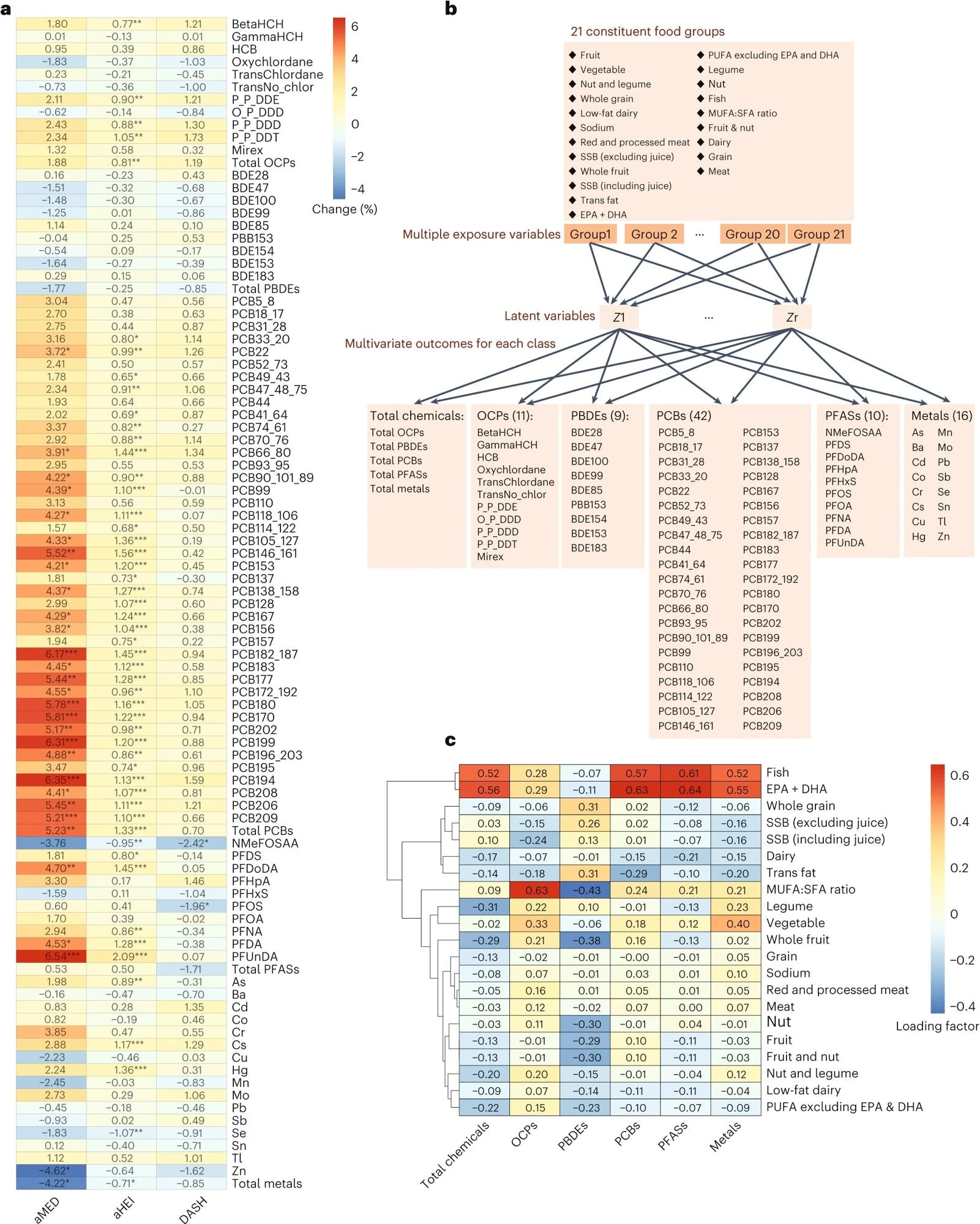a, Per cent difference in grouped and individual plasma chemical concentrations per 1 s.d. increase in dietary pattern indices of aHEI, aMED and DASH. All estimations were assessed by multivariable linear regression models with adjustment for maternal race/ethnicity, age, physical activity level, pre-pregnancy body mass index (BMI), education level, income, parity, tobacco exposure and total energy intake. Significance with two-sided raw P value <0.05 is bolded. To account for multiple comparisons, Benjamini–Hochberg (BH)-adjusted P values were calculated. *P < 0.001, **P < 0.01, ***P < 0.05. Per cent change ((exp(β) − 1) × 100) was reported to benefit interpretation. b, Conceptual diagram of the Kernal RRR. The black arrows represent the dependency structure. c, The loading effect of different food groups and components on chemical classes with residuals of the above confounders adjusted, which can help describe the strength and directionality of how the intake of each food group is loaded onto a specific dietary pattern with different chemical classes. SSB, sugar-sweetened beverage; PUFA, polyunsaturated fatty acid.a Percent difference in grouped and individual plasma chemical concentrations per 1 s.d. increase in dietary pattern indices of aHEI, aMED, and DASH. All estimations were assessed by multivariable linear regression models with adjustments for maternal race/ethnicity, age, physical activity level, pre-pregnancy body mass index (BMI), education level, income, parity, tobacco exposure, and total energy intake. Significance with two-sided raw P value <0.05 is bolded. To account for multiple comparisons, Benjamini–Hochberg (BH)-adjusted P values were calculated. *P < 0.001, **P < 0.01, ***P < 0.05. Percent change ((exp(β) − 1) × 100) was reported to benefit interpretation. b, Conceptual diagram of the Kernal RRR. The black arrows represent the dependency structure. c, The loading effect of different food groups and components on chemical classes with residuals of the above confounders adjusted, which can help describe the strength and directionality of how the intake of each food group is loaded onto a specific dietary pattern with different chemical classes. SSB, sugar-sweetened beverage; PUFA, polyunsaturated fatty acid.