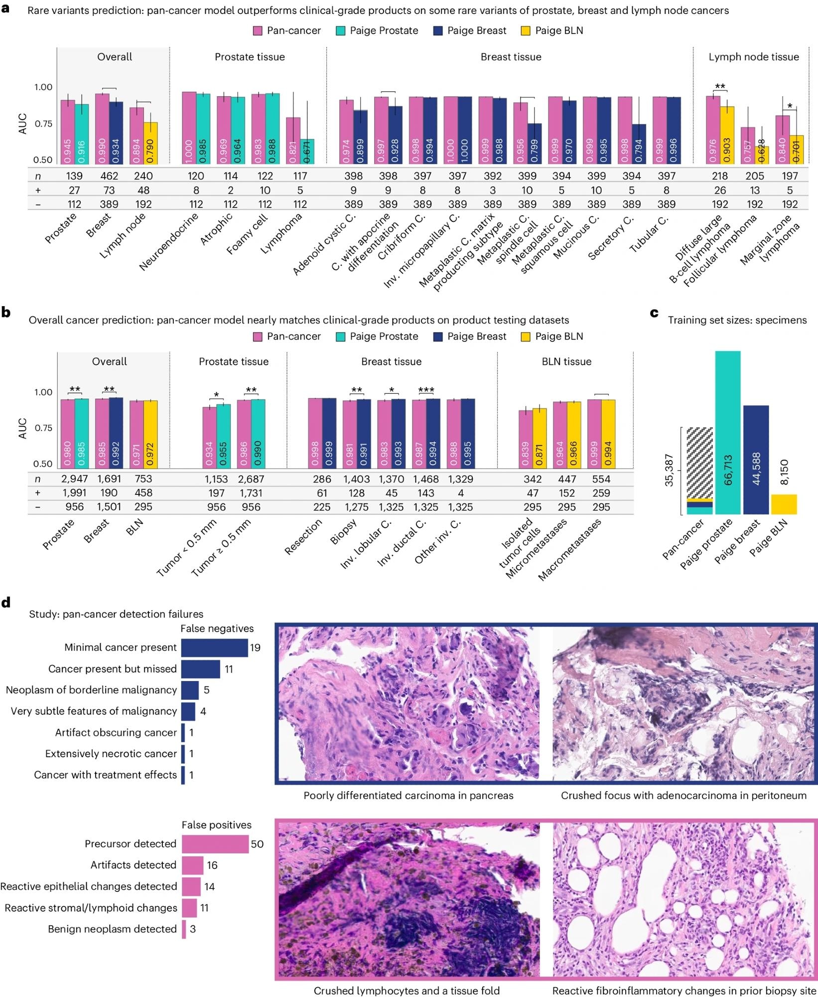 a,b, Performance as measured by AUC of three clinical products compared to the pan-cancer model trained on Virchow embeddings, on the rare variant (a) and product testing datasets (b). The pan-cancer detector, trained on Virchow foundation model embeddings, achieves similar performance to clinical-grade products in general and outperforms them on rare variants of cancers. c, The pan-cancer detector was trained on fewer labeled specimens than the Prostate, Breast and BLN clinical models, including a small fraction of the prostate (teal), breast (blue) and BLN (yellow) tissue specimens that these clinical models were respectively trained on. d, A categorization of failure models of the pan-cancer model and four canonical examples of the primary types of failures. In all panels, * is used to indicate pairwise statistical significance (*P < 0.05, **P < 0.01, ***P < 0.001, ****P < 0.0001; pairwise DeLong’s test). Error bars denote the two-sided 95% confidence interval, estimated with DeLong’s method. C., carcinoma. Inv., invasive.