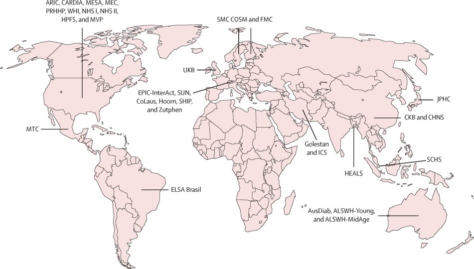 Twelve cohorts were from the Americas, two from the Eastern Mediterranean region, nine from Europe, one from Southeast Asia, and seven from the Western Pacific. Eligible participants were 18 years of age or older and provided data on dietary consumption and incident T2D. Any individuals with missing data or who were diagnosed with any type of diabetes were excluded from the analysis.
