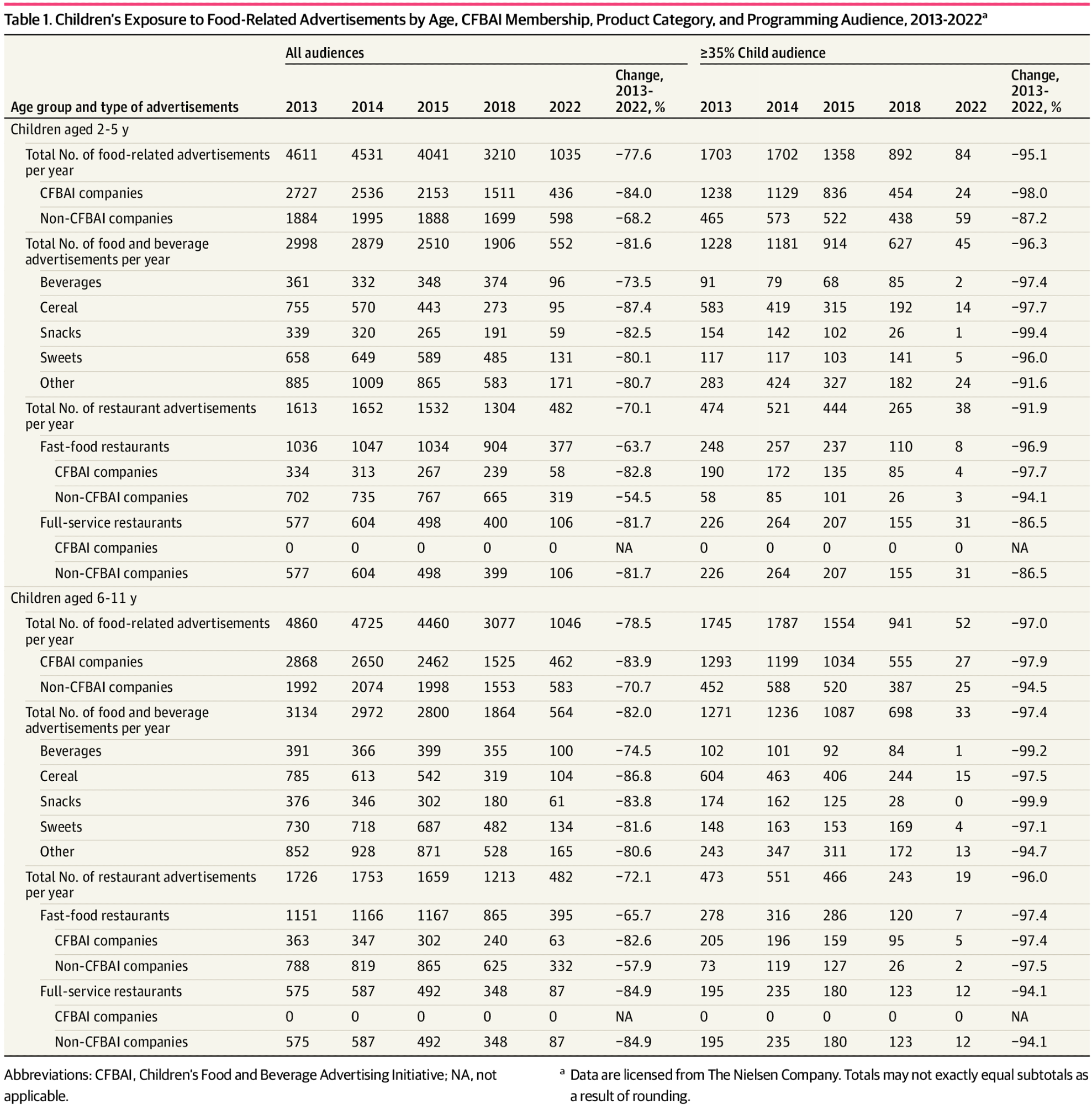 Nielsen company household- and individual-level television ratings on advertisement exposure were also determined between 2013 and 2015, as well as in 2018 and 2022, with these ratings stratified by race. The ratings information included exposure from cable networks, broadcast networks, syndicated television commercials, and spot advertising exclusively observed in local broadcast areas.