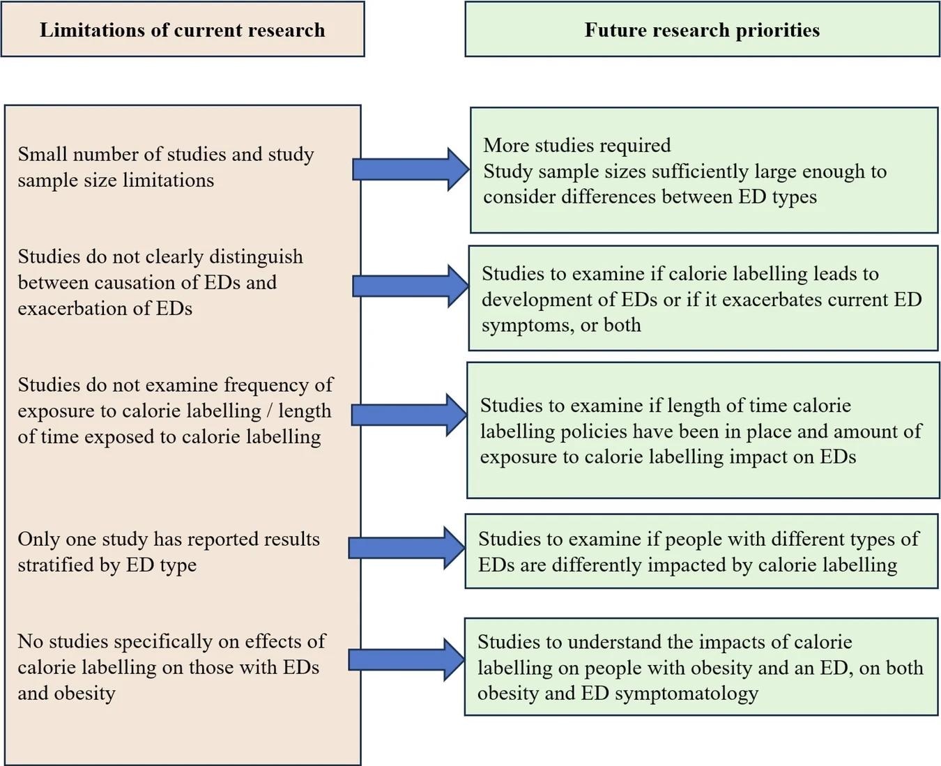 Further studies are also needed to understand the impact of calorie labeling on people living with obesity and an eating disorder, as well as on those living with different types of eating disorders, including binge eating disorder, anorexia nervosa, and bulimia nervosa.
