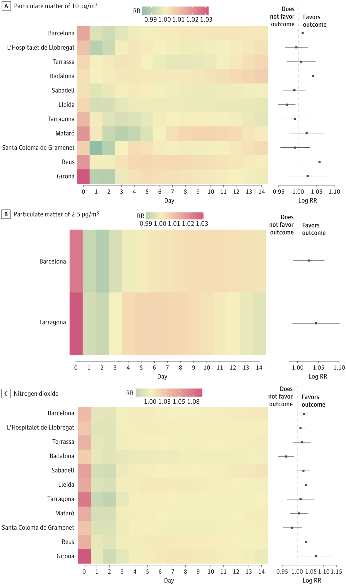 Study data was acquired between June 2012 and December 2019 from the Public Data Analysis for Health Research and Innovation Program (health data) and the Atmospheric Pollution Monitoring and Forecasting Network of the Catalan government (air quality data) and included the 11 most populous cities from Catalonia, Spain.
