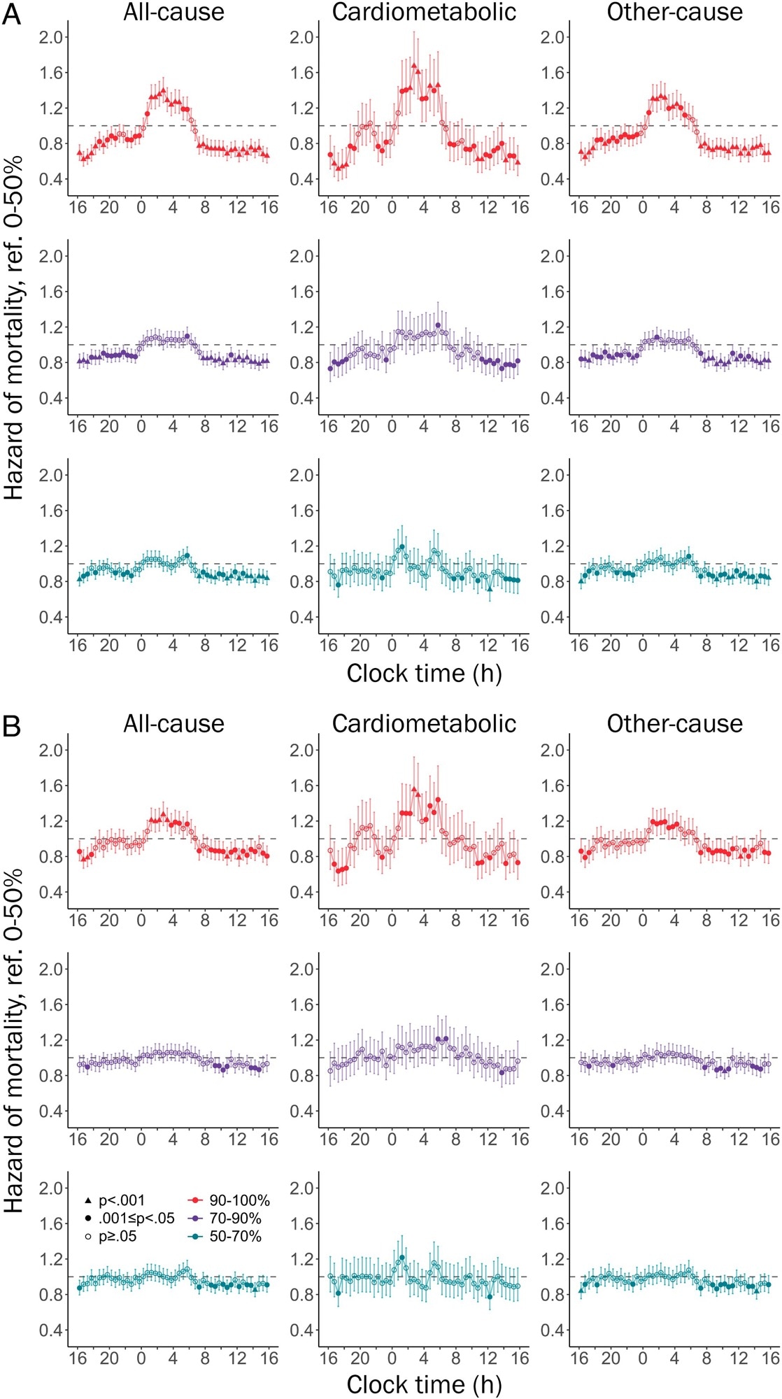 On the other hand, exposure to brighter daylight was found to correlate with lower risks of all-cause mortality (aHR range: 0.66 to 0.90) and cardiometabolic mortality (aHR range: 0.61 to 0.84).
