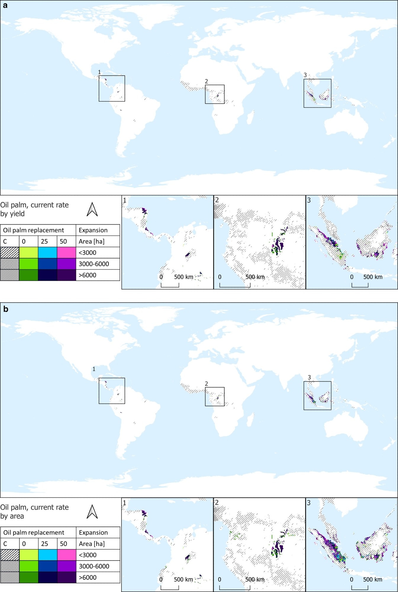 Potential future distribution of oil palm plantations for food use in 2050 under the ‘current consumption rate scenario.’ Suitable areas are designated based on the potential for higher attainable yields (a) and proximity to existing oil palm plantations (b). Grey lines indicate the current distribution, with three cover intensities (< 3, 3–6, > 6 kha). Colored pixels, with three cover intensities, indicate future suitable areas for oil palm plantations. Specifically, violet pixels indicate areas suitable to host plantations in the 50% palm oil replacement scenario; blue pixels indicate those areas suitable to complement the violet areas in the 25% palm oil replacement scenario; and green pixels indicate areas suitable to complement the violet and the green areas in the no palm oil replacement scenario.