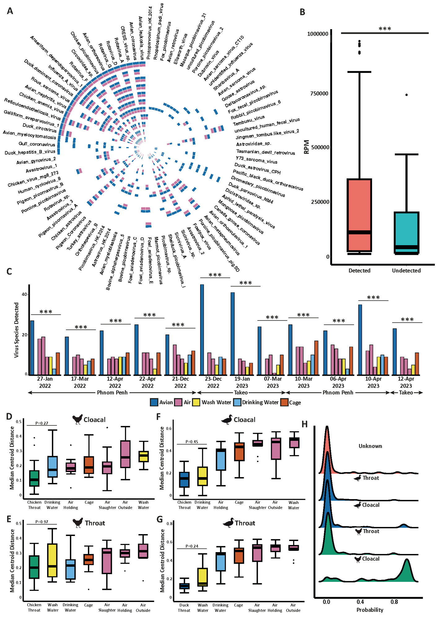 Environmental metagenomics accurately detects circulating poultry pathogens. A) Circular heatmap depicts virus detection between poultry swabs and the environment. Whereby a given virus was found in at least poultry sample a blue cell is shown and whereby that same virus was found in at least one environmental sample at the same time and location an adjacent pink cell is shown. Each track of the heatmap represents one visit to an LBM. B) Boxplot showing the difference in virus abundance between taxa that were successfully detected or undetected from panel A. Statistics were calculated using a Wilcox test. C) Bar plot showing the total number of unique viruses detected in poultry swabs compared to each individual environmental sample at each sampling date. Statistics were calculated using Fishers exact test best all groups. Based on PCoA in Supplementary Figure 5, we calculated the distance of all samples from the median centroid coordinates of D) cloacal and E) oropharyngeal swabs obtained from domestic chickens as well as F) cloacal and G) throat swabs obtained from domestic ducks. Statistics were calculated using a Kruskall-Wallis with Dunns post-hoc test. H) Ridge plot showing the probability of each poultry swab being the source of pathogenic viruses for all environmental samples. Statistics were calculated using a Kruskall-Wallis with Dunns post-hoc test. All P-values obtained were corrected for false-discovery rate (FDR) using the Benjamini-Hochberg method. P values are annotated as follows: P < 0.05 ; P < 0.01 ; P < 0.001.
