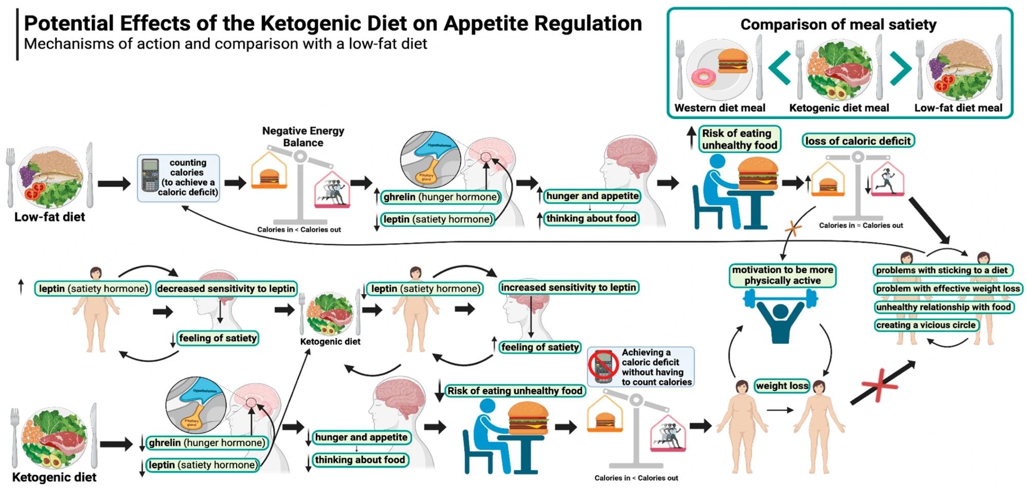 On the other hand, KD suppresses the hunger hormone ghrelin and increases the release of satiety hormones. These effects are thought to be mediated in part through ketone bodies, such as β-hydroxybutyrate (BHB), which influence appetite-regulating hormones and may contribute to the reduced sense of hunger. A study in which individuals with type 2 diabetes reported feeling less hungry while following a KD, even as they lost weight and improved their health markers, demonstrated this.