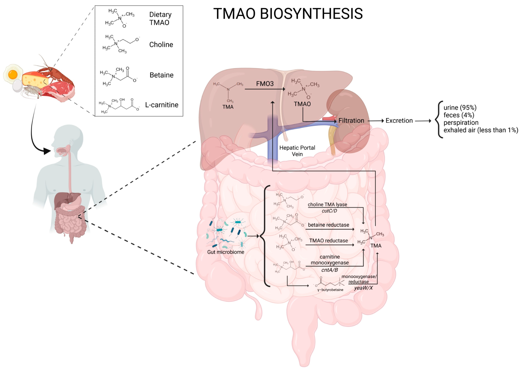 The human gut microbiota plays a crucial role in processing dietary components, especially by producing metabolites that influence health. One such compound, TMAO, forms when gut bacteria break down choline and carnitine, which are found in red meat, eggs, and dairy. These are converted to trimethylamine (TMA), which is then oxidized by the liver enzyme flavin-containing monooxygenase 3 (FMO3) to produce TMAO.