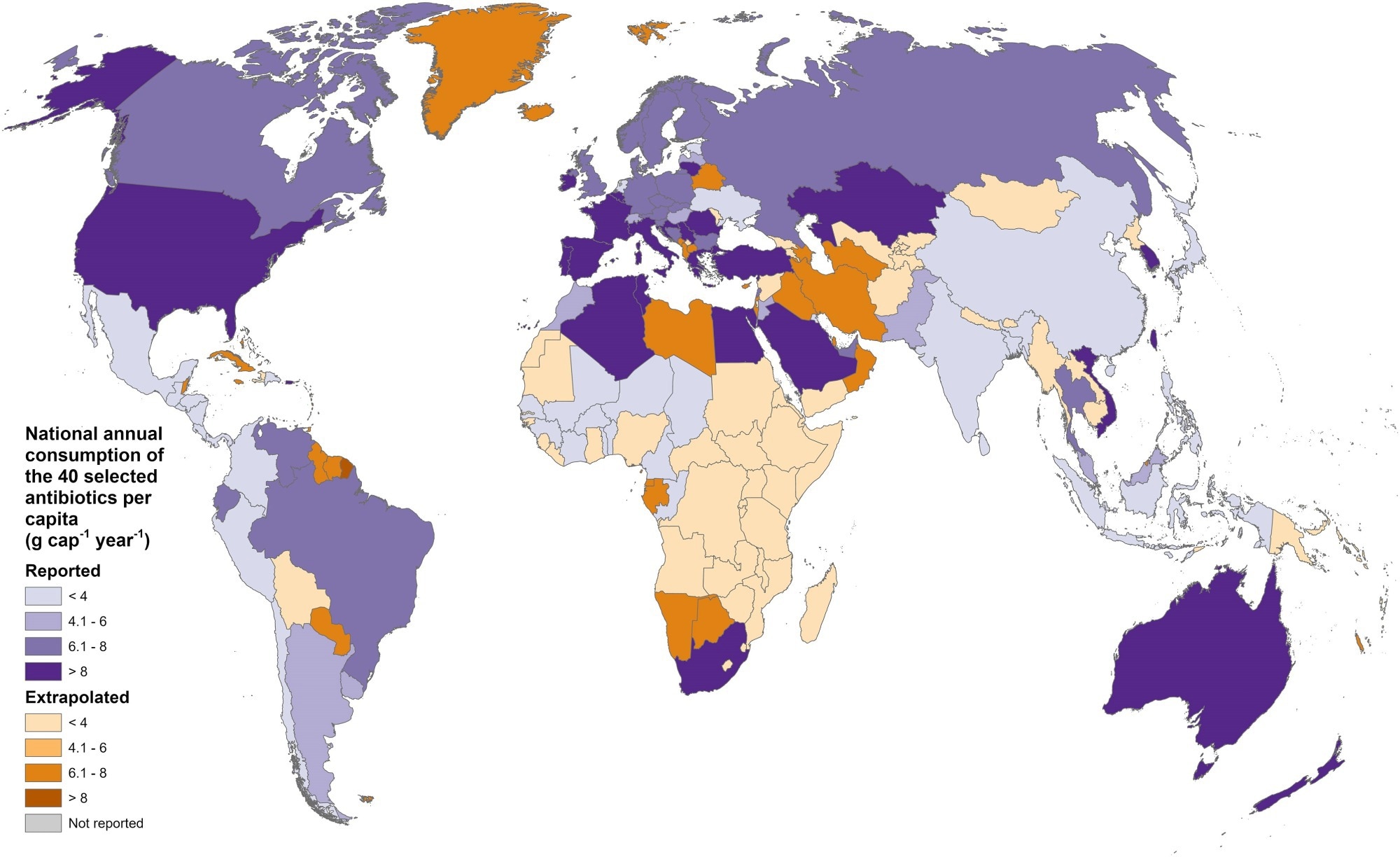 Annual consumption of the 40 antibiotics selected for inclusion in this study, aggregated by country. Reported values are from Klein et al. (20), and extrapolated values were calculated based on the methodology described in the paper.