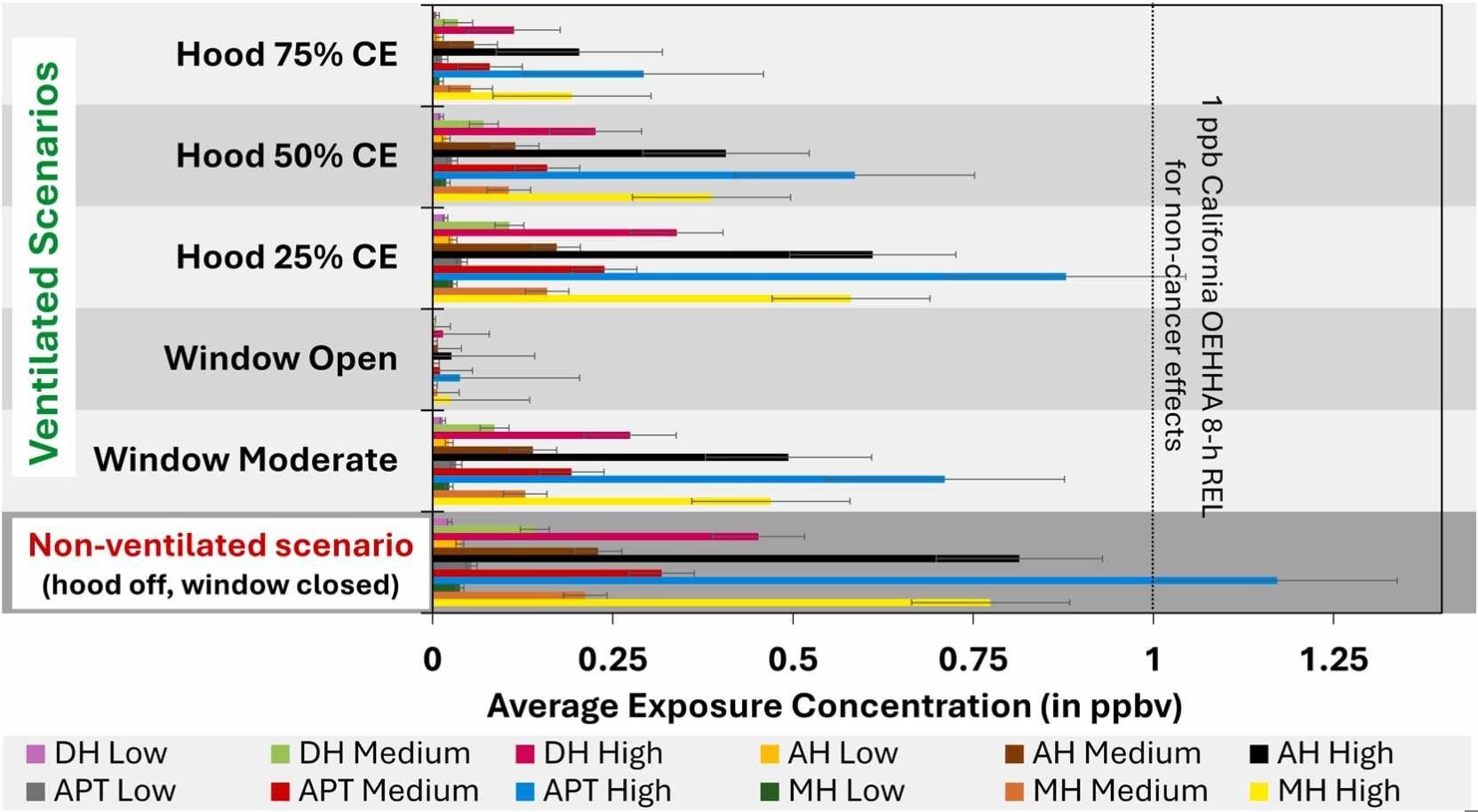 Daily average benzene exposure concentration (ppbv) for ventilated and non-ventilated scenarios. Hood 25 % CE, 50 % CE, and 75 % CE represent the benzene capture efficiency of the hoods installed in dwellings. In this image, DH Low, DH Medium, and DH High represent benzene concentration in a detached home with low, medium, and high stove usage, respectively. Similarly, APT, MH, and AH indicate apartments, mobile homes, and attached homes, respectively. The error bars in these graphs represent the range of possible benzene exposure concentrations. Note: All these scenarios compared the top 5 % of benzene-emitting gas stoves for U.S. homes.Daily average benzene exposure concentration (ppbv) for ventilated and non-ventilated scenarios. Hood 25 % CE, 50 % CE, and 75 % CE represent the benzene capture efficiency of the hoods installed in dwellings. In this image, DH Low, DH Medium, and DH High represent benzene concentration in a detached home with low, medium, and high stove usage, respectively. Similarly, APT, MH, and AH indicate apartments, mobile homes, and attached homes, respectively. The error bars in these graphs represent the range of possible benzene exposure concentrations. Note: All these scenarios compared the top 5 % of benzene-emitting gas stoves for U.S. homes.