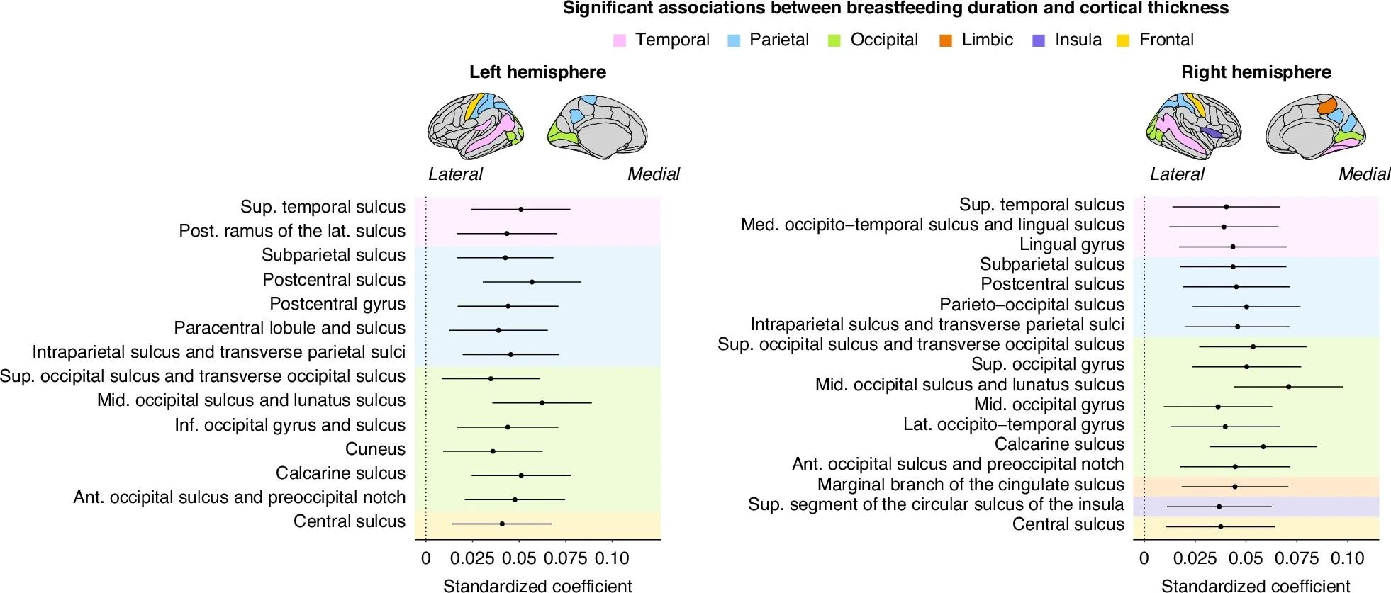 These models were adjusted for prematurity, education, and sex. Only regions that survived the Benjamini–Hochberg correction are shown. The left panel refers to regions within the left hemisphere. The right panel shows the regions in the right hemisphere. Ant anterior, Post posterior, Sup superior, Inf inferior, Lat lateral, Mid middle, Med Medial, Hor Horizontal.These models were adjusted for prematurity, education, and sex. Only regions that survived the Benjamini–Hochberg correction are shown. The left panel refers to regions within the left hemisphere. The right panel shows the regions in the right hemisphere. Ant anterior, Post posterior, Sup superior, Inf inferior, Lat lateral, Mid middle, Med Medial, Hor Horizontal.