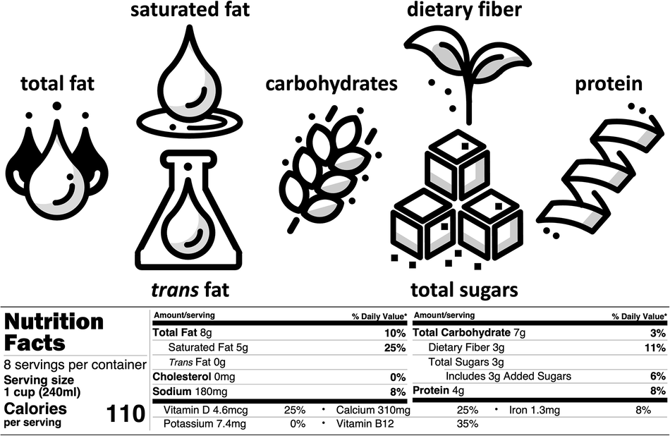 The nutrition label contains information about macronutrients, including total fat, saturated and trans fat, carbohydrates, dietary fiber and sugars, and protein, and micronutrient,s including vitamins and minerals. The example provides the nutritional information for a plant-based milk product.