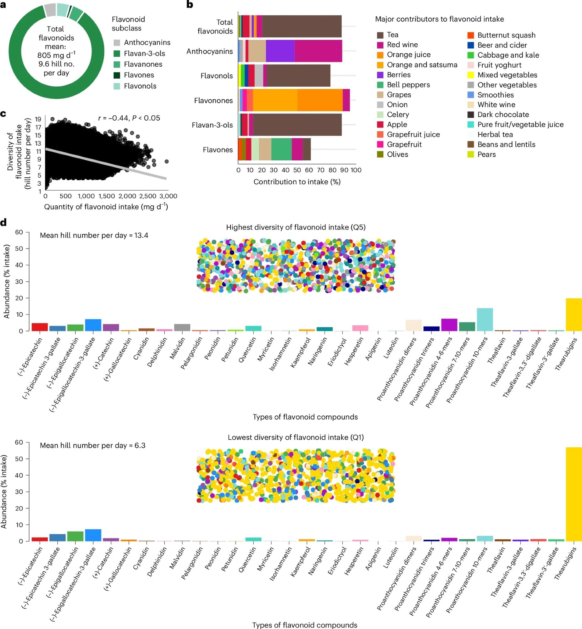 a, Composition of flavonoid intake. b, Major dietary contributors to flavonoid intake, showing the topmost contributors to intake only; blank spaces up to 100% represent other smaller contributors that are not shown. c, Two-sided Pearson correlation between quantity and diversity of flavonoid intake. d, Diversity of flavonoid consumption among participants with the most (Q5) and least (Q1) diverse intakes. In d, the bar charts are matched for quantity of flavonoid intake (1,000 mg d−1) and show the average abundance (% intake) of each flavonoid per day. The dotted areas represent each diet, where each circle is an individual flavonoid and each colour is a different flavonoid (corresponding to the colours and distribution on the bar charts). Data from participants with ≥2 Oxford WebQ dietary questionnaires (n = 124,805).