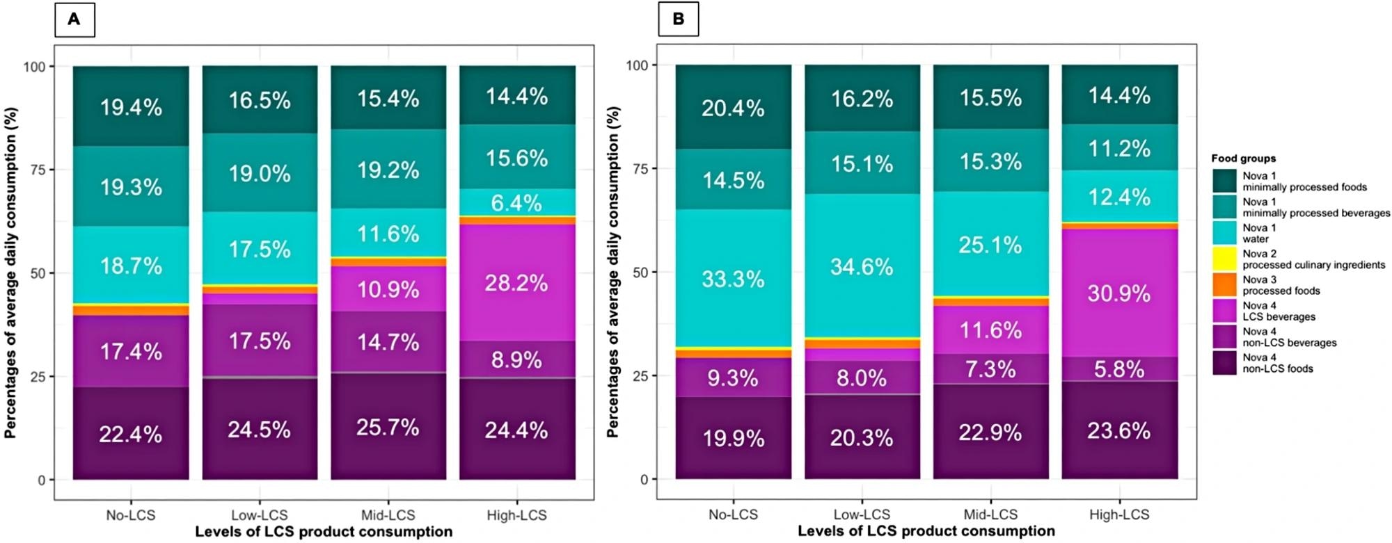 Grams of dietary intake by Nova subgroup in 2008–2009 (A) and 2018–2019 (B). A (N = 646). Percentages of dietary intake by Nova subgroups. No-LCS: Nova 2 processed culinary ingredients, 0.4%; Nova 3 processed foods and beverages, 2.3%. Low-LCS: Nova 2 processed culinary ingredients, 0.5%; Nova 3 processed foods and beverages, 1.6%; Nova 4 LCS beverages, 2.6; Nova 4 LCS foods, 0.5%. Mid-LCS: Nova 2 processed culinary ingredients, 0.4%; Nova 3 processed foods and beverages, 1.8%; Nova 4 LCS foods, 0.4%. High-LCS: Nova 2 processed culinary ingredients, 0.3%; Nova 3 processed foods and beverages, 1.7%; Nova 4 LCS foods, 0.3%. B (N = 424). Percentages of dietary intake by Nova subgroups. No-LCS: Nova 2 processed culinary ingredients, 0.6%; Nova 3 processed foods and beverages, 2.0%. Low-LCS: Nova 2 processed culinary ingredients, 0.5%; Nova 3 processed foods and beverages, 2.1%; Nova 4 LCS beverages, 3.0; Nova 4 LCS food, 0.2%. Mid-LCS: Nova 2 processed culinary ingredients, 0.5%; Nova 3 processed foods, 1.7%; Nova 4 LCS foods, 0.1%. High-LCS: Nova 2 processed culinary ingredients, 0.3%; Nova 3 processed foods, 1.3%; Nova 4 LCS foods, 0.1%Grams of dietary intake by Nova subgroup in 2008–2009 (A) and 2018–2019 (B). A (N = 646). Percentages of dietary intake by Nova subgroups. No-LCS: Nova 2 processed culinary ingredients, 0.4%; Nova 3 processed foods and beverages, 2.3%. Low-LCS: Nova 2 processed culinary ingredients, 0.5%; Nova 3 processed foods and beverages, 1.6%; Nova 4 LCS beverages, 2.6; Nova 4 LCS foods, 0.5%. Mid-LCS: Nova 2 processed culinary ingredients, 0.4%; Nova 3 processed foods and beverages, 1.8%; Nova 4 LCS foods, 0.4%. High-LCS: Nova 2 processed culinary ingredients, 0.3%; Nova 3 processed foods and beverages, 1.7%; Nova 4 LCS foods, 0.3%. B (N = 424). Percentages of dietary intake by Nova subgroups. No-LCS: Nova 2 processed culinary ingredients, 0.6%; Nova 3 processed foods and beverages, 2.0%. Low-LCS: Nova 2 processed culinary ingredients, 0.5%; Nova 3 processed foods and beverages, 2.1%; Nova 4 LCS beverages, 3.0; Nova 4 LCS food, 0.2%. Mid-LCS: Nova 2 processed culinary ingredients, 0.5%; Nova 3 processed foods, 1.7%; Nova 4 LCS foods, 0.1%. High-LCS: Nova 2 processed culinary ingredients, 0.3%; Nova 3 processed foods, 1.3%; Nova 4 LCS foods, 0.1%