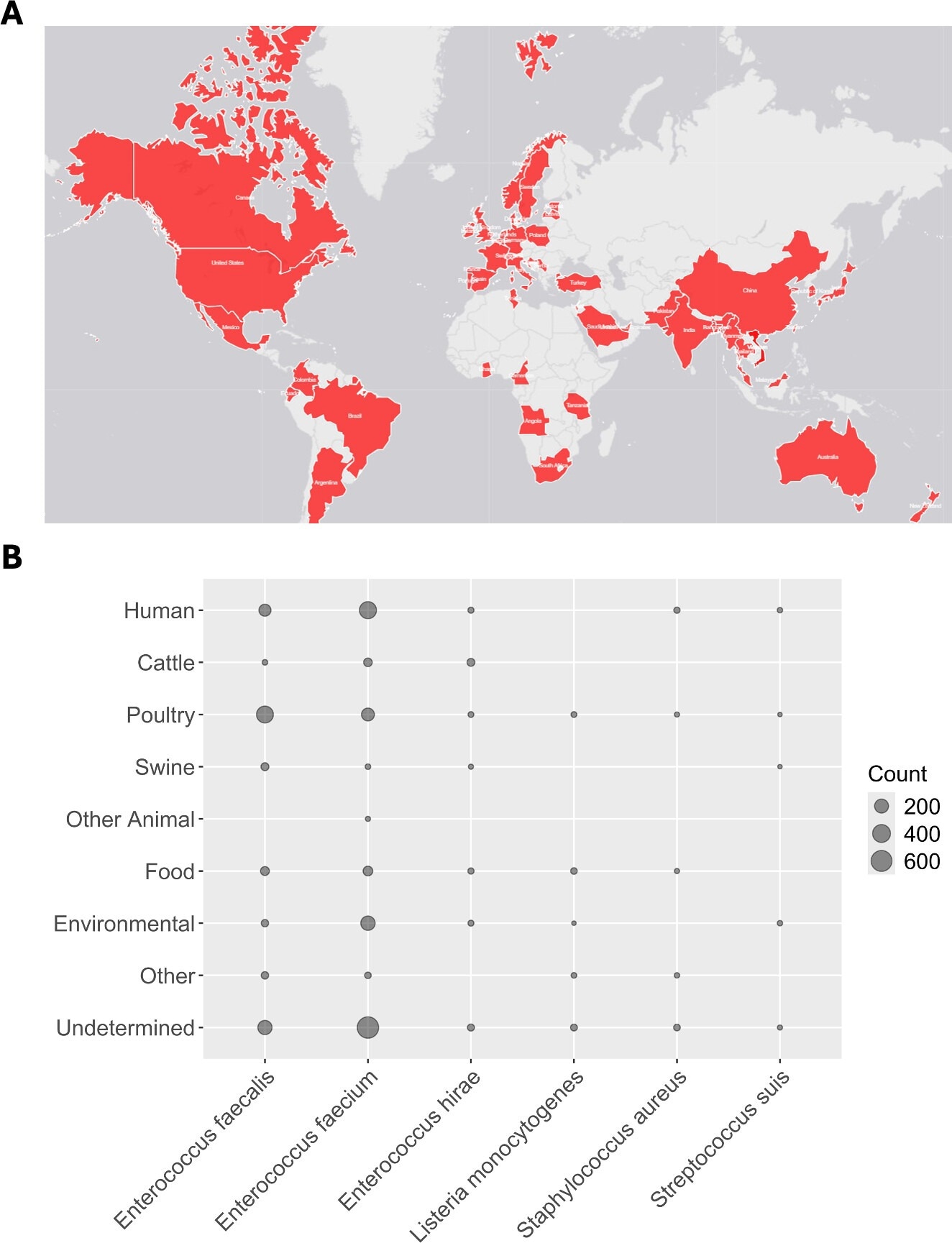 Distribution of narA/B. (A) World map showing the geographic distribution of narAB. (B) Distribution of narAB amongst bacterial and host species. Bubble size is proportional to the number of detected isolates. Four bacterial species are excluded due to total sample sizes of less than 5 (Campylobacter jejuni, Clostridium perfringens, Listeria innocua, and Streptococcus agalactiae).