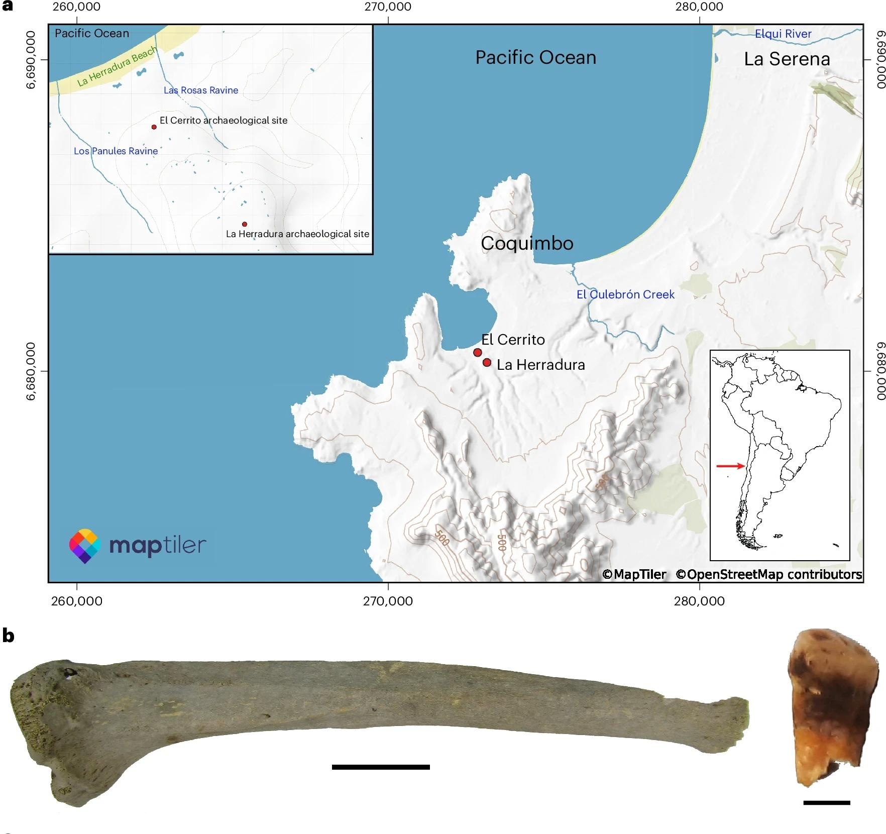 a, Map of the semi-arid region of Chile showing the location of the two archaeological sites under study. Coordinates follow the universal transverse mercator (UTM) system (Datum WGS 84, Zone 19J); values are given as easting and northing (m). Map created with the MapTiler plugin within QGIS. b, Skeletal elements that yielded the two ancient genomes of M. lepromatosis: left, tibia from ECR001 (scale bar, 5 cm); right, tooth from ECR003 (scale bar, 0.5 cm).a, Map of the semi-arid region of Chile showing the location of the two archaeological sites under study. Coordinates follow the universal transverse mercator (UTM) system (Datum WGS 84, Zone 19J); values are given as easting and northing (m). Map created with the MapTiler plugin within QGIS. b, Skeletal elements that yielded the two ancient genomes of M. lepromatosis: left, tibia from ECR001 (scale bar, 5 cm); right, tooth from ECR003 (scale bar, 0.5 cm).