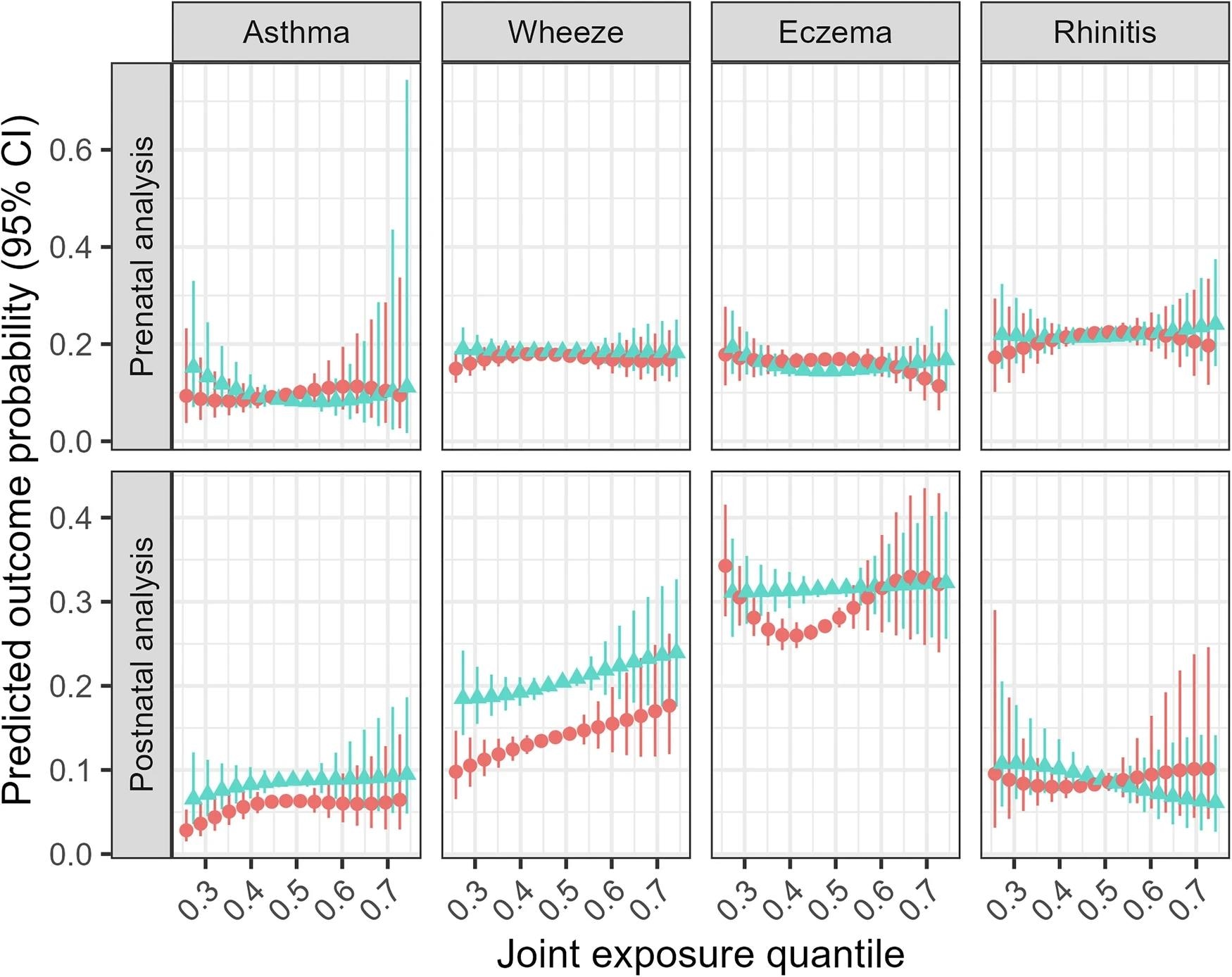 Multivariate dose‒response relationship between the overall chemical mixture and childhood allergic conditions stratified by sex. Red circles: Females. Blue triangles: Male. Models obtained with quantile G-computation. Prenatal analysis models adjusted for cohort membership, maternal age, ethnicity, parental education, marital status, family history of asthma, prenatal tobacco smoke exposure, and season of birth. Postnatal analysis models were further adjusted for breastfeeding duration, age at outcome assessment, postnatal smoke exposure and gestational age.Multivariate dose‒response relationship between the overall chemical mixture and childhood allergic conditions stratified by sex. Red circles: Females. Blue triangles: Male. Models obtained with quantile G-computation. Prenatal analysis models adjusted for cohort membership, maternal age, ethnicity, parental education, marital status, family history of asthma, prenatal tobacco smoke exposure, and season of birth. Postnatal analysis models were further adjusted for breastfeeding duration, age at outcome assessment, postnatal smoke exposure and gestational age.