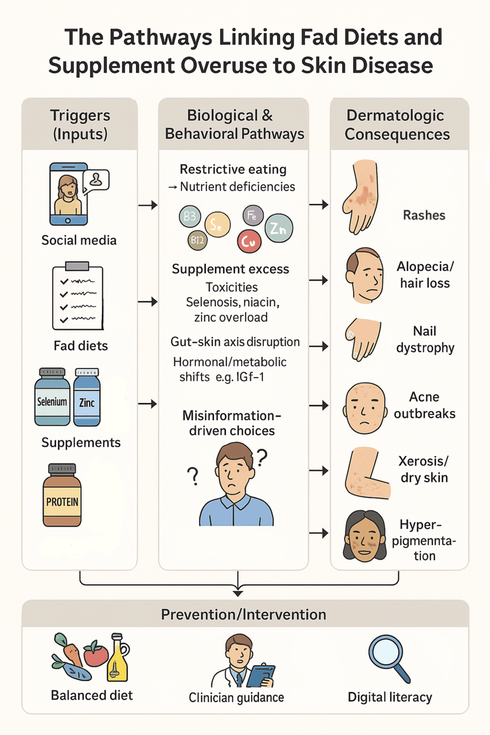 The Digital-to-Dermis Cascade: How Social Media Drives Diet-Related Skin Disease - The multi-factorial pathways linking fad diets, supplement overuse, and misinformation to dermatologic disease. Social media and online trends drive restrictive or excessive nutrition behaviors, resulting in deficiencies or toxicities that manifest with a range of cutaneous findings. Prevention centers on balanced diet, patient education, and critical appraisal of online health information. Figure rendered by the authors using Procreate (2025).
