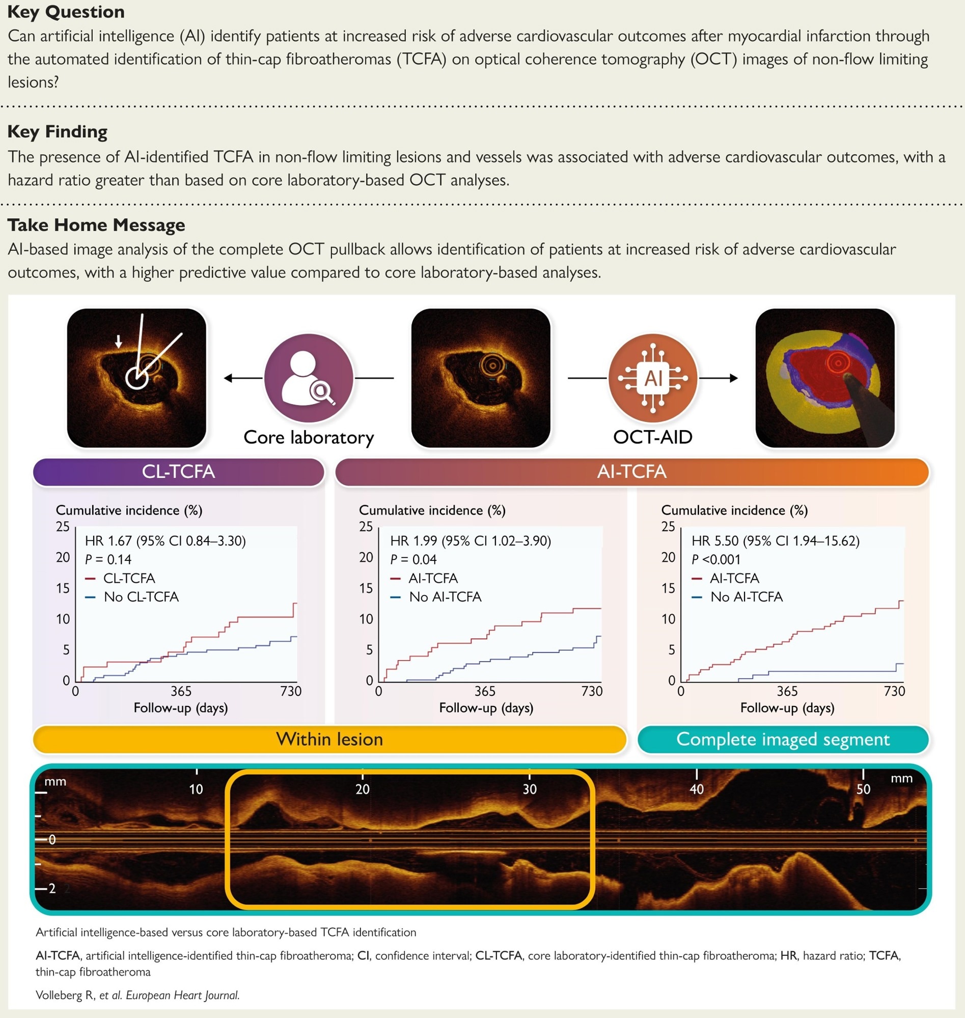 AI applied to OCT standardized TCFA detection and identified patients at increased risk after MI. Compared with CL assessment of visually selected lesions, evaluating the complete imaged segment yielded stronger prognostic discrimination and a high NPV that can reassure low-risk patients while focusing attention on those at higher risk. Because frame-by-frame manual reading is time-consuming and variable, automated analysis could help translate high-resolution imaging into practical decisions about secondary prevention, surveillance, and focal therapy. Analyses were performed offline in a single observational dataset, and prospective on-site validation is still needed before routine adoption.