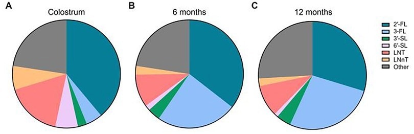 ![Relative abundance of the six core HMOs in breast milk between 0 and 12 months of age. Ratios of the six individual HMOs were calculated in relation to total HMO concentration. Ratios were calculated by taking the quotient of average individual HMO levels divided by average total HMO level at the respective timepoint and multiplying by 100%. “Other” was calculated as 100% - [Sum % of 2′-FL, 3-FL,3′-SL, 6′-SL, LNT, LNnT]. (A) Colostrum, (B) 6 months, (C) 12 months.](https://www.intakehealthlab.com/images/news/ImageForNews_818597_1757378468615770.jpg)