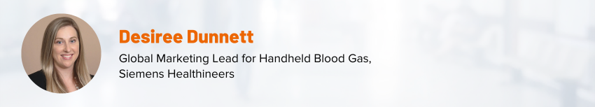 Desiree Dunnett is a medical laboratory scientist and currently the global marketing lead for handheld blood gas at Siemens Healthineers. Before her time at Siemens Healthineers, Desiree worked at Cleveland Clinic for 10 years, spending 7 years as a point-of-care specialist. During her 7 years in POCT, Desiree oversaw several CLIA laboratories, including the launch of Mobile Stroke Unit.