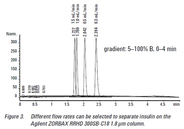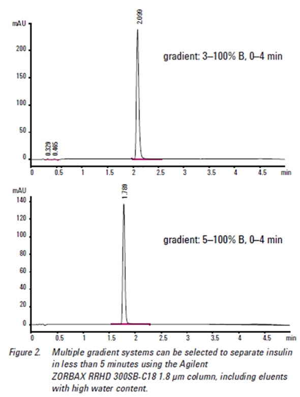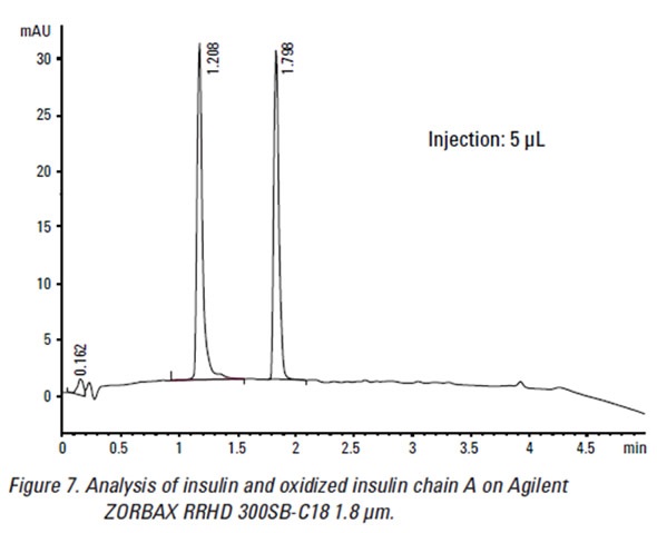 The results showed that using Agilent ZORBAX Rapid Resolution High Definition (RRHD) 300SB-C18 1.8 µm columns resulted in faster and reliable separation of the isoforms and purified versions of insulin from the sample.