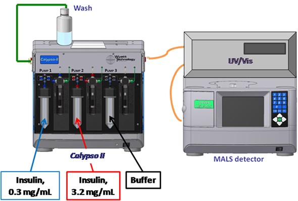 CG-MALS experiments were carried out using the Wyatt Calypso® II hardware to create concentration gradients corresponding to a miniDAWN™ TREOS® three-angle light scattering photometer (Figure 1) and a Shimadzu SPD-6AV UV/Vis spectrometer. The CALYPSO™ software was used to match the light scattering and concentration data to various self-association models to find the association scheme that best defined the data.
