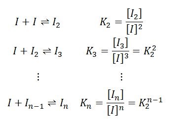 Instead, the light scattering and concentration measurements are best matched by an isodesmic self-assembly model. According to this model, each insulin monomer combines with a growing insulin cluster with constant affinity as follows: