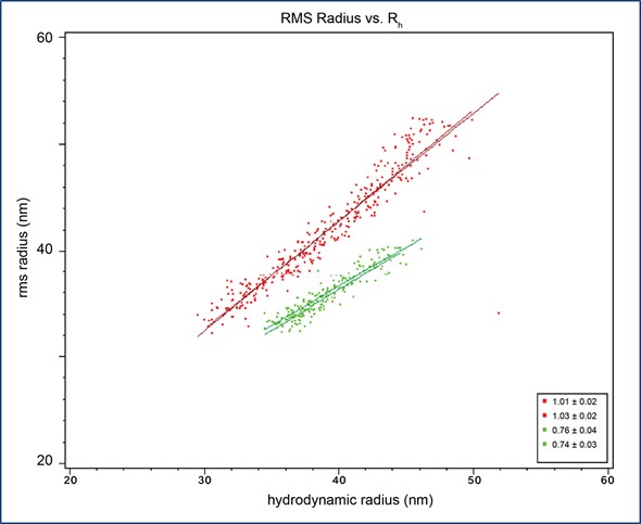Figure 2. Root-mean square radius, Rg, plotted against hydrodynamic radius, Rh, for empty liposome sample (red) and filled liposome sample (green). The slopes for empty and filled liposomes are 1.0 and 0.75, respectively.