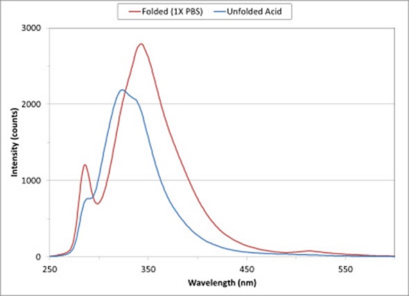 On exposure to 0.1 M HCl/KCl solution, the conformational state of the protein changes to expose the tryptophan and tyrosine amino acids to the solvent. As the protein moves from a folded state in 1X PBS (indicated by the red curve) to the unfolded state (indicated by the blue curve), the intensity of the fluorescence spectrum decreases and peak fluorescence moves to a shorter wavelength.